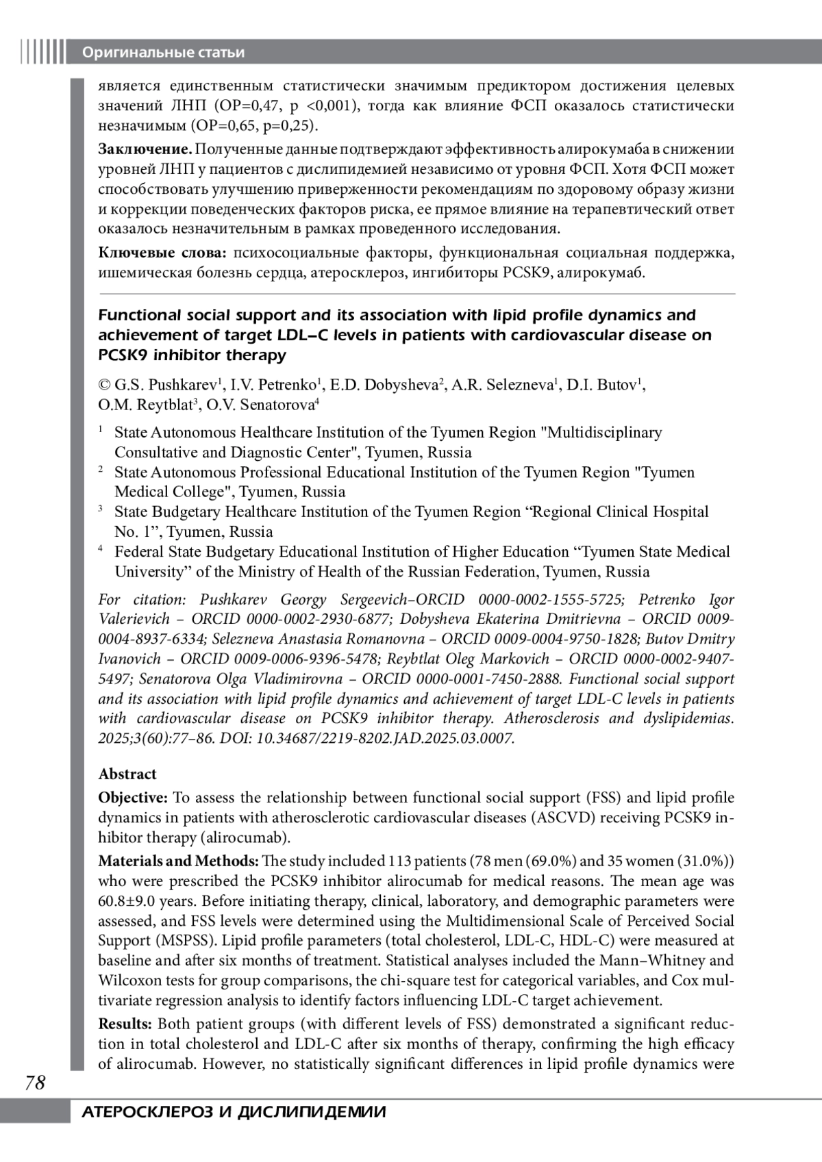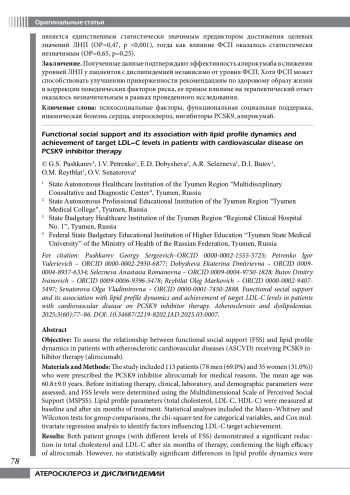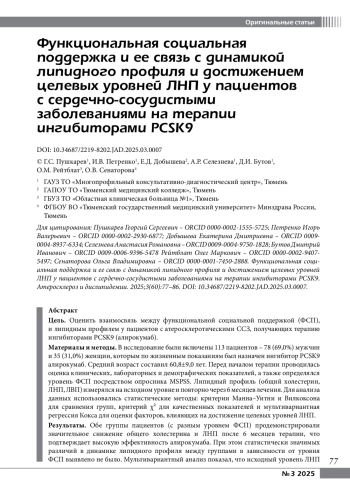 Цель. Оценить взаимосвязь между функциональной социальной поддержкой (ФСП), и липидным профилем у пациентов с атеросклеротическими ССЗ, получающих терапию ингибиторами PCSK9 (алирокумаб).