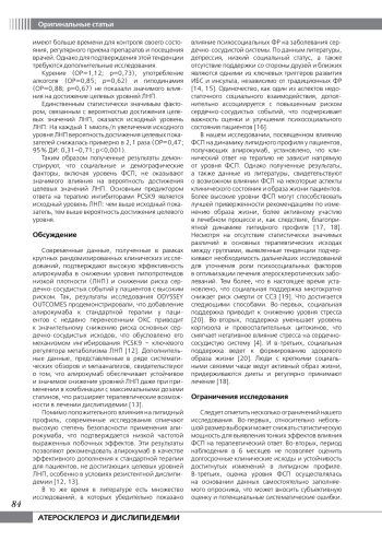 Заключение. Полученные данные подтверждают эффективность алирокумаба в снижении уровней ЛНП у пациентов с дислипидемией независимо от уровня ФСП. Хотя ФСП может способствовать улучшению приверженности рекомендациям по здоровому образу жизни и коррекции поведенческих факторов риска, ее прямое влияние на терапевтический ответ оказалось незначительным в рамках проведенного исследования.