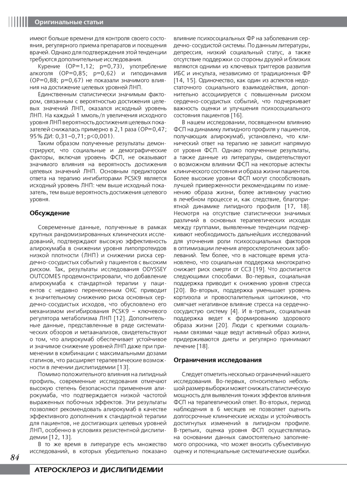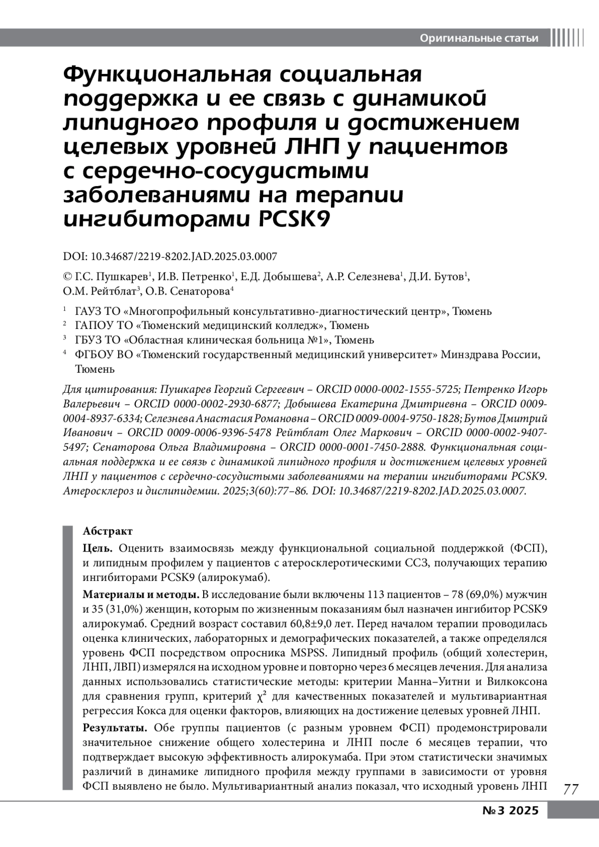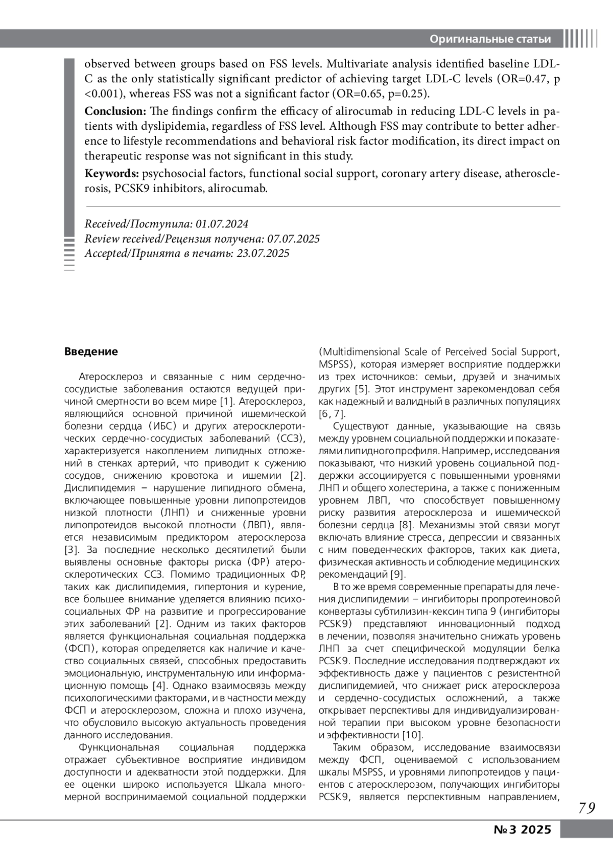Материалы и методы. В исследование были включены 113 пациентов – 78 (69,0%) мужчин и 35 (31,0%) женщин, которым по жизненным показаниям был назначен ингибитор PCSK9 алирокумаб. Средний возраст составил 60,8±9,0 лет. Перед началом терапии проводилась оценка клинических, лабораторных и демографических показателей, а также определялся уровень ФСП посредством опросника MSPSS. Липидный профиль (общий холестерин, ЛНП, ЛВП) измерялся на исходном уровне и повторно через 6 месяцев лечения. Для анализа данных использовались статистические методы: критерии Манна–Уитни и Вилкоксона для сравнения групп, критерий χ² для качественных показателей и мультивариантная регрессия Кокса для оценки факторов, влияющих на достижение целевых уровней ЛНП.