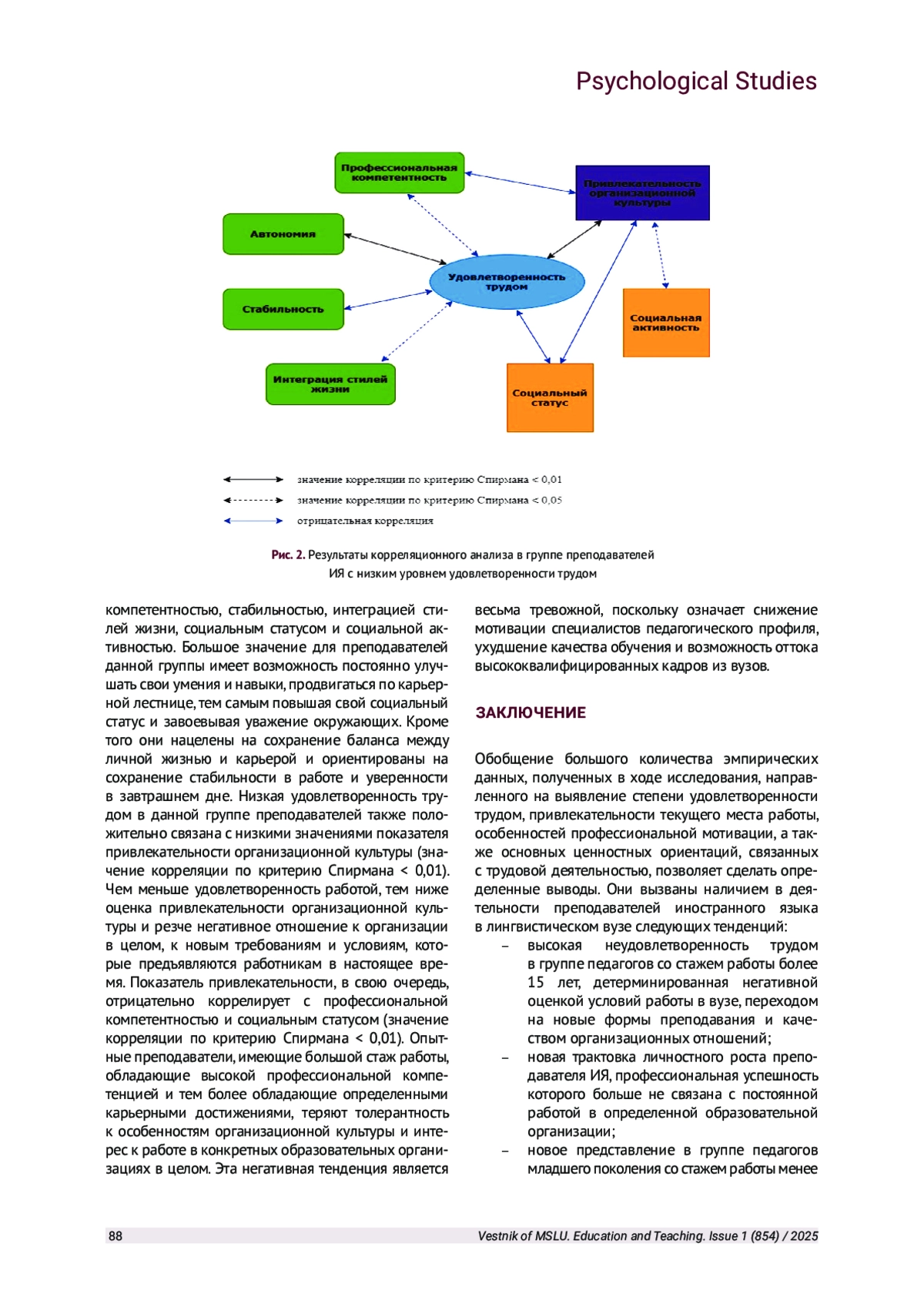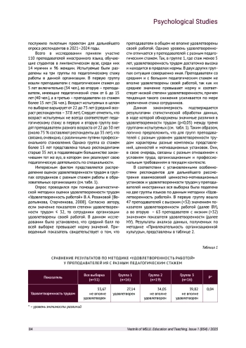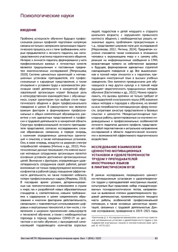 В статье рассматриваются результаты исследования взаимосвязи ценностно-мотивационных установок и удовлетворенности трудом у преподавателей иностранных языков в лингвистическом вузе. В ходе исследования было обнаружено изменение уровня удовлетворенности, а также карьерных ориентаций и мотивационных установок у преподавателей иностранных языков в зависимости от стажа работы в конкретном вузе. В исследовании установлены значимые изменения в ценностно-мотивационной структуре личности педагогов при реализации профессиональной деятельности в современных условиях образовательной среды.