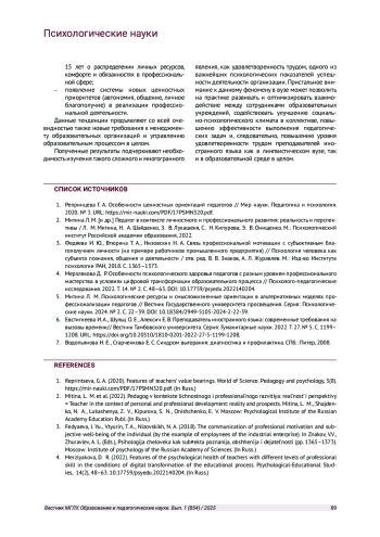 4. Мерзлякова Д. Р. Особенности психологического здоровья педагогов с разным уровнем профессионального мастерства. в условиях цифровой трансформации образовательного процесса // Психолого-педагогические исследования. 2022. Т. 14. № 2. С. 48-63. DOI: 10.17759/psyedu.2022140204 EDN: AHYFXC