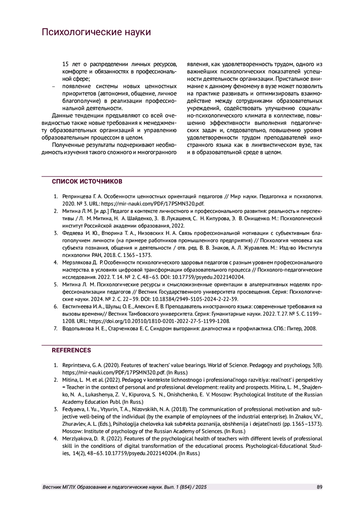 1. Репринцева Г. А. Особенности ценностных ориентаций педагогов // Мир науки. Педагогика и психология. 2020. № 3. URL: https://mir-nauki.com/PDF/17PSMN320.pdf.