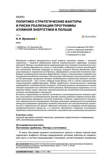 В статье, опирающейся на методы системного и институционального анализа, впервые в российском исследовательском контуре изучены политико-стратегические факторы реализации программы атомной энергетики в Польше, отраженные в документах стратегического планирования. В рамках реализации эмпирического исследования автор рассматривает программу атомной энергетики как многоаспектный политический и стратегический проект, обращает внимание на специфику сопутствующих внутриполитических процессов, а в качестве прикладного измерения исследования определяет внешнеполитические следствия и оценивает риски реализации программы.