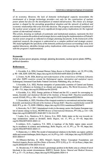 4.Кувалдин, С. А. 2022. Энергетические политики Польши и ЕС: поиск совпадающих интересов, Научно-аналитический вестник Института Европы РАН, № 6, с. 106—116, EDN: HGGFRC, https://doi.org/10.15211/vestnikieran62022106116