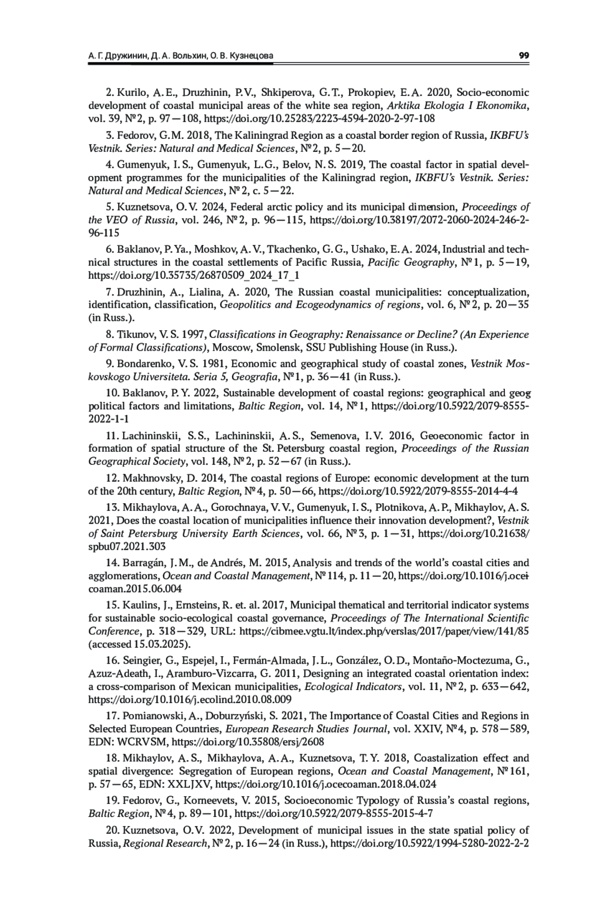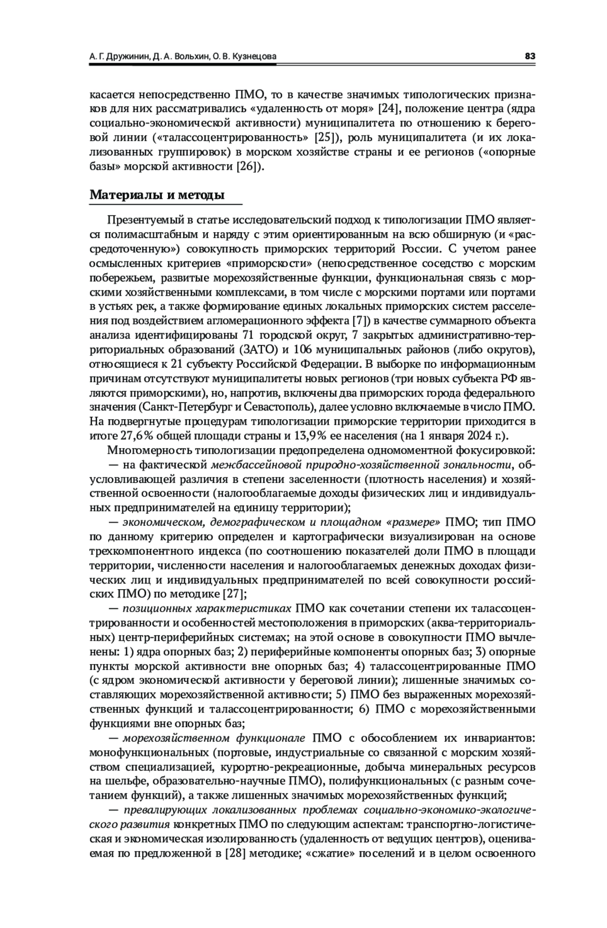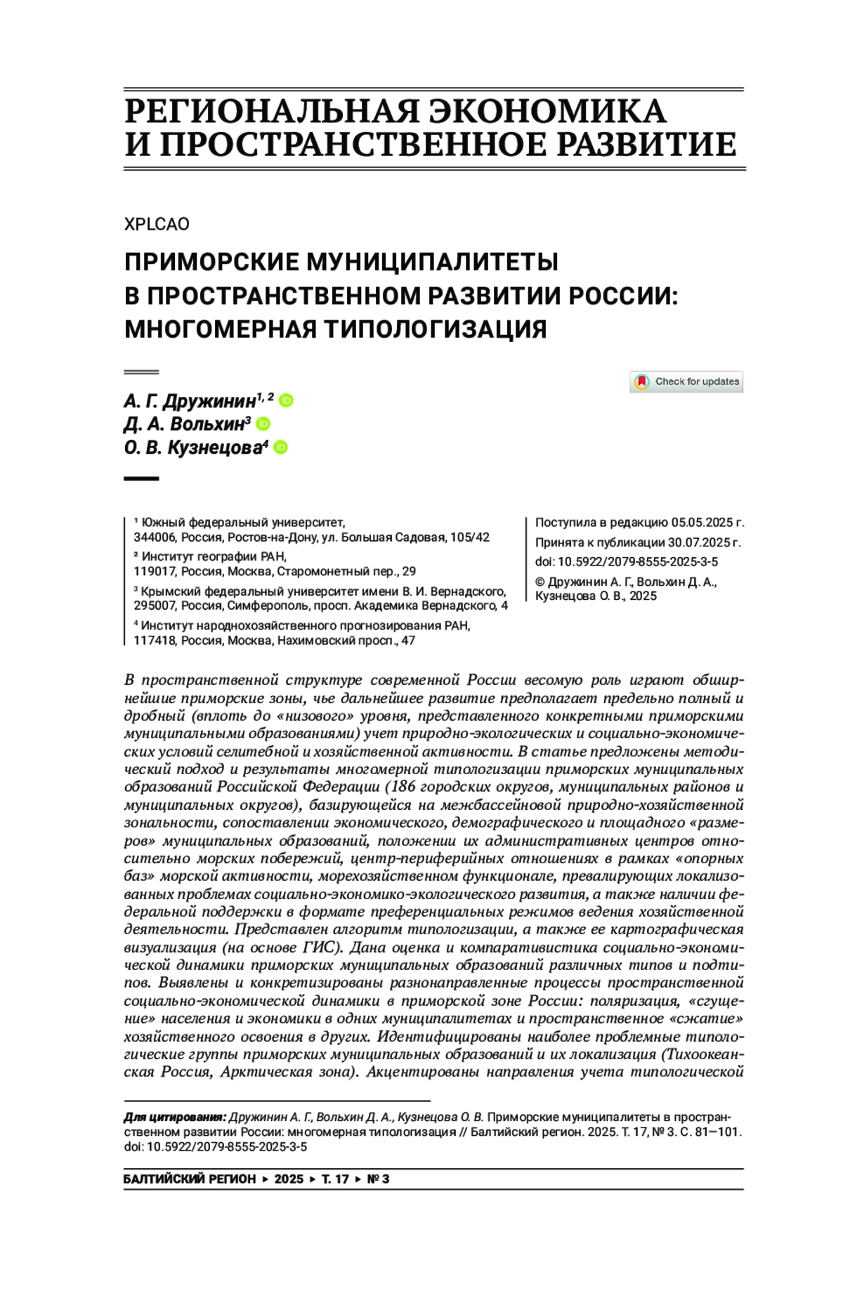 7.Дружинин, А. Г., Лялина, А. В. 2020, Приморские муниципалитеты России: концептуализация, идентификация, типологизация, Геополитика и экогеодинамика регионов, т. 6, № 2, с. 20—35, EDN: LPVNCG