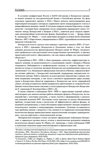 Статья посвящена анализу деятельности германских политических фондов в Белоруссии в период 2014—2020 гг. на примере Фонда имени Ф. Эберта и Фонда имени К. Аденауэра. Исследование основано на неоклассическом реализме и рассматривает фонды как акторов, действующих автономно, но в русле внешней политики Германии. Проанализированы мероприятия и аналитические документы фондов, их контакты с белорусским обществом и властью в контексте приближения к политическому кризису 2020 г. Фонд Эберта делал акцент на социально-экономических реформах, подчеркивая «устарелость» белорусской экономической модели, что создавало почву для запроса на западную поддержку. Фонд Аденауэра фокусировался на вопросах безопасности. Сделан вывод, что лишь часть усилий фондов была направлена на внутреннюю трансформацию белорусского режима. На практике на первый план вышла геополитическая логика действий фондов в стремлении повлиять на региональный порядок, добившись через пропаганду «нейтралитета» Белоруссии ослабления военно-политических позиций России в Балтийском регионе, в том числе в контексте Калининградского эксклава. Исследование не выявило достаточных публичных признаков решающего воздействия фондов на развитие внутрибелорусских оппозиционных организационных центров в контексте кризиса 2020 г. Вместо этого приоритет зачастую отдавался формированию транснациональных экспертных сетей, нацеленных на продвижение прозападных геополитических нарративов в Белоруссии. Полученный вывод ставит под вопрос распространенное мнение о немецких политических фондах как акторах «демократизации», отягощенных идеологическими шаблонами, представляя их как подвижных и прагматичных операторов, действующих в геополитической логике.
