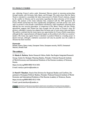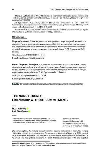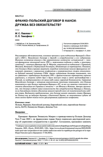 Рассмотрены обстоятельства, основные причины и цели подписания Францией и Польшей в 2025 г. Нансийского договора о дружбе и сотрудничестве и его содержание. Изучение соглашения вписано в два сравнительных контекста: исторический — польско-французских отношений после 1991 г., переживших подъемы и спады, и пространственный — политики Франции при Э. Макроне, нацеленной на подписание с Германией, Италией, Испанией и Португалией договоров, обновляющих их партнерство. Показано, что договор в Нанси призван закрепить очередное потепление польско-французских отношений, связанное с украинским конфликтом и неуверенностью сторон относительно будущей внешней политики США. Анализ содержания договора показывает, что по сравнению с предыдущим договором 1991 г. франко-польское партнерство серьезно укрепилось, а стороны видят друг в друге важную опору в свете противоборства с Россией, но воздерживаются от каких-либо новых гарантий безопасности. Сравнение Нансийского договора с четырьмя аналогичными текстами показывает, что Польша вовлекается в круг близких партнеров Франции в ЕС, но все же заметно «отстает» по степени сближения от Германии и отчасти — от Италии и Испании. Авторы заключают, что договор создает новые возможности для сотрудничества Франции и Польши, но их дальнейшая степень сближения зависит прежде всего от политической воли лидеров стран. Выдвинуто предположение, что договор может означать ставку Франции на Польшу как на ведущую державу в Восточной Европе, но окончательно судить об этом можно будет только после урегулирования украинского конфликта.