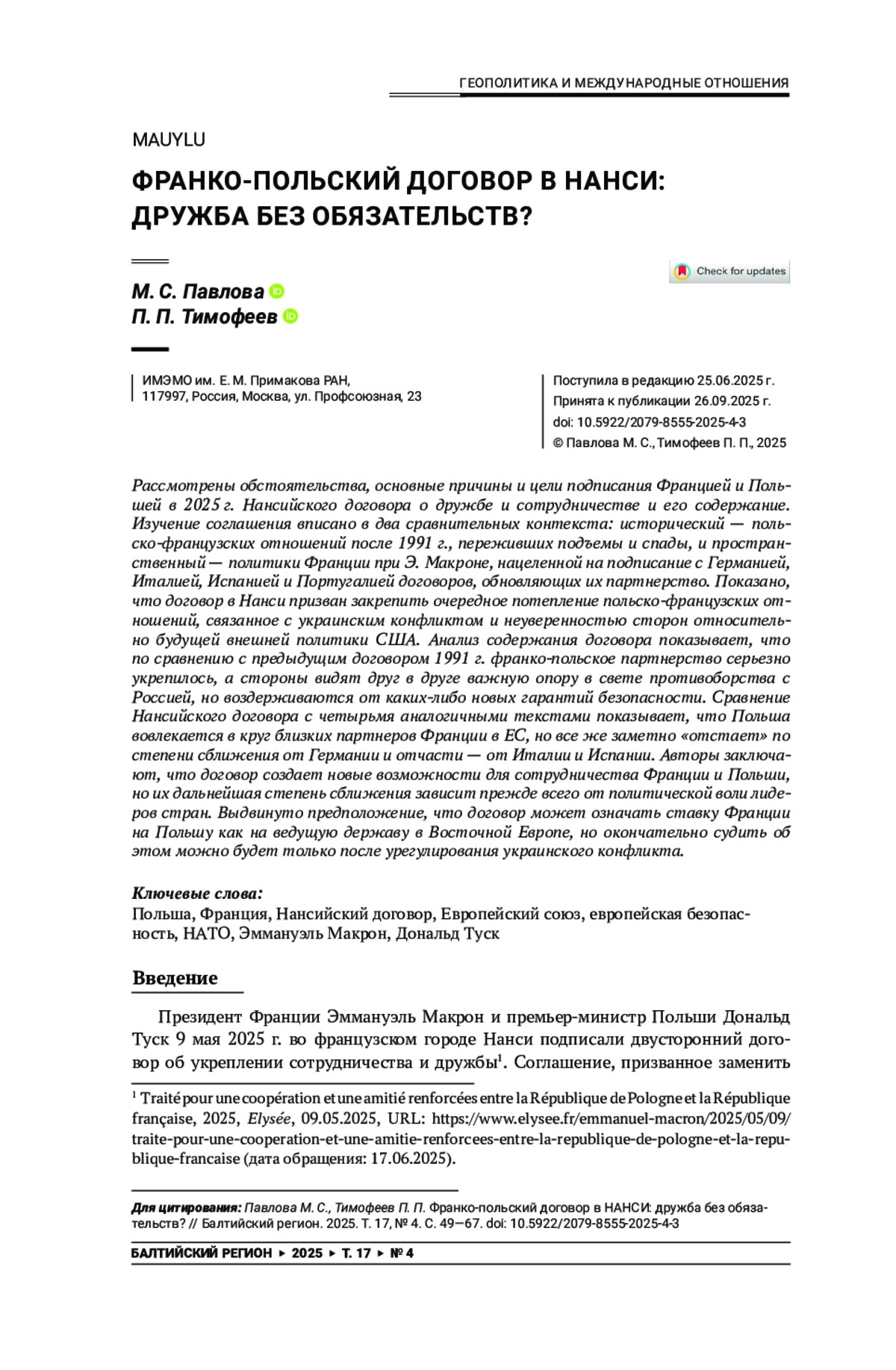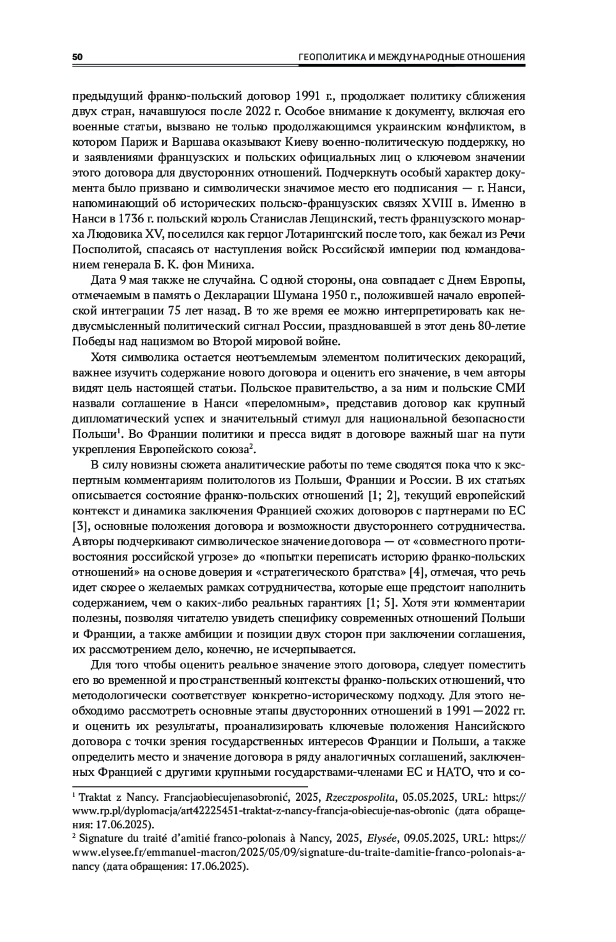 Souverbie, L. 2025, Traité de Nancy: vers un renforcement stratégique et sécuritaire des relations franco-polonaises?, IRIS, 16.05.2025, URL: https://www.iris-france.org/traite-de-nancy-vers-un-renforcement-strategique-et-securitaire-des-relations-franco-polonaises/ (дата обращения: 17.06.2025).