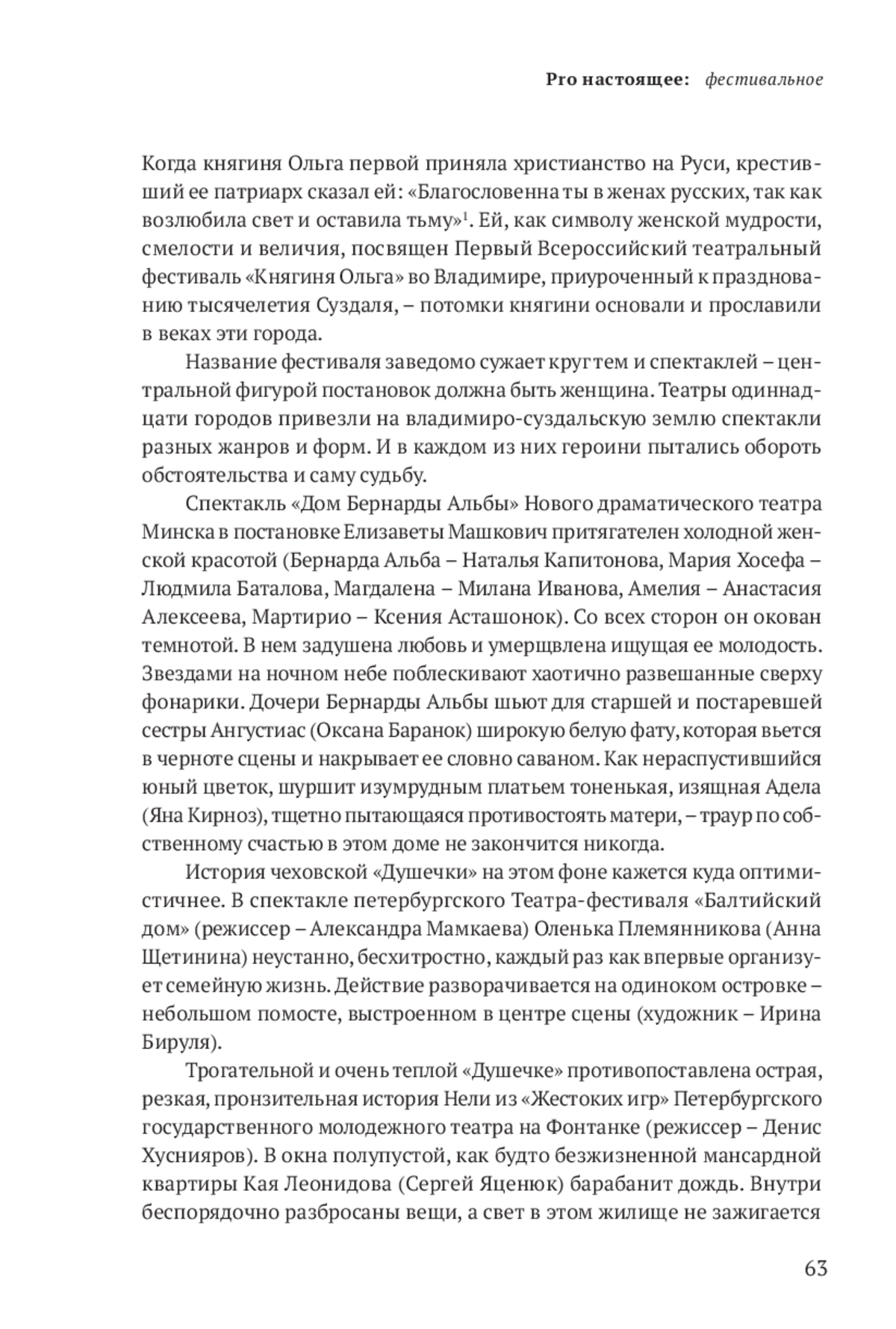 Когда княгиня Ольга первой приняла христианство на Руси, крестивший ее патриарх сказал ей: «Благословенна ты в женах русских, так как возлюбила свет и оставила тьму»1. Ей, как символу женской мудрости, смелости и величия, посвящен Первый Всероссийский театральный фестиваль «Княгиня Ольга» во Владимире, приуроченный к празднованию тысячелетия Суздаля, – потомки княгини основали и прославили в веках эти города.
