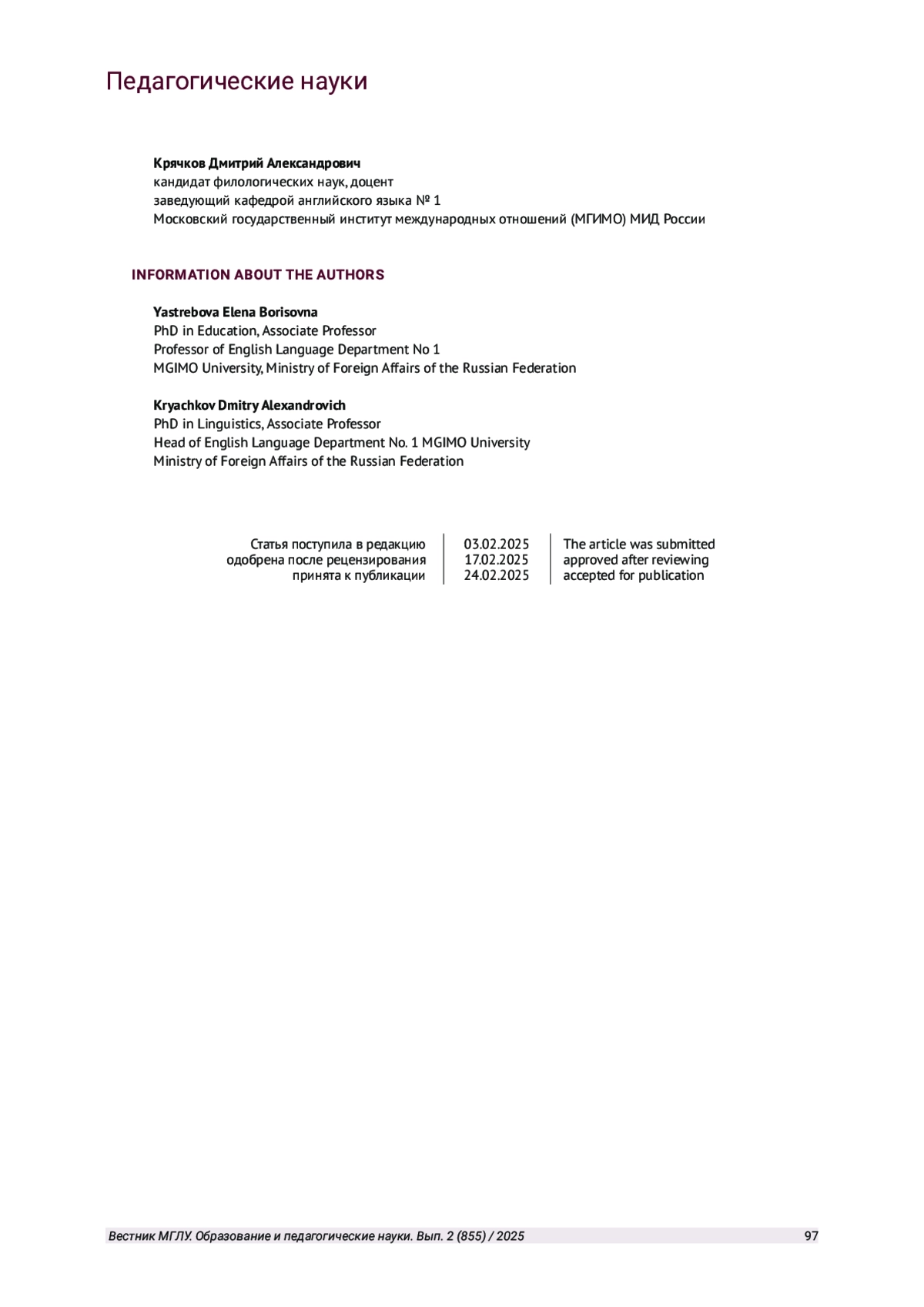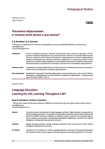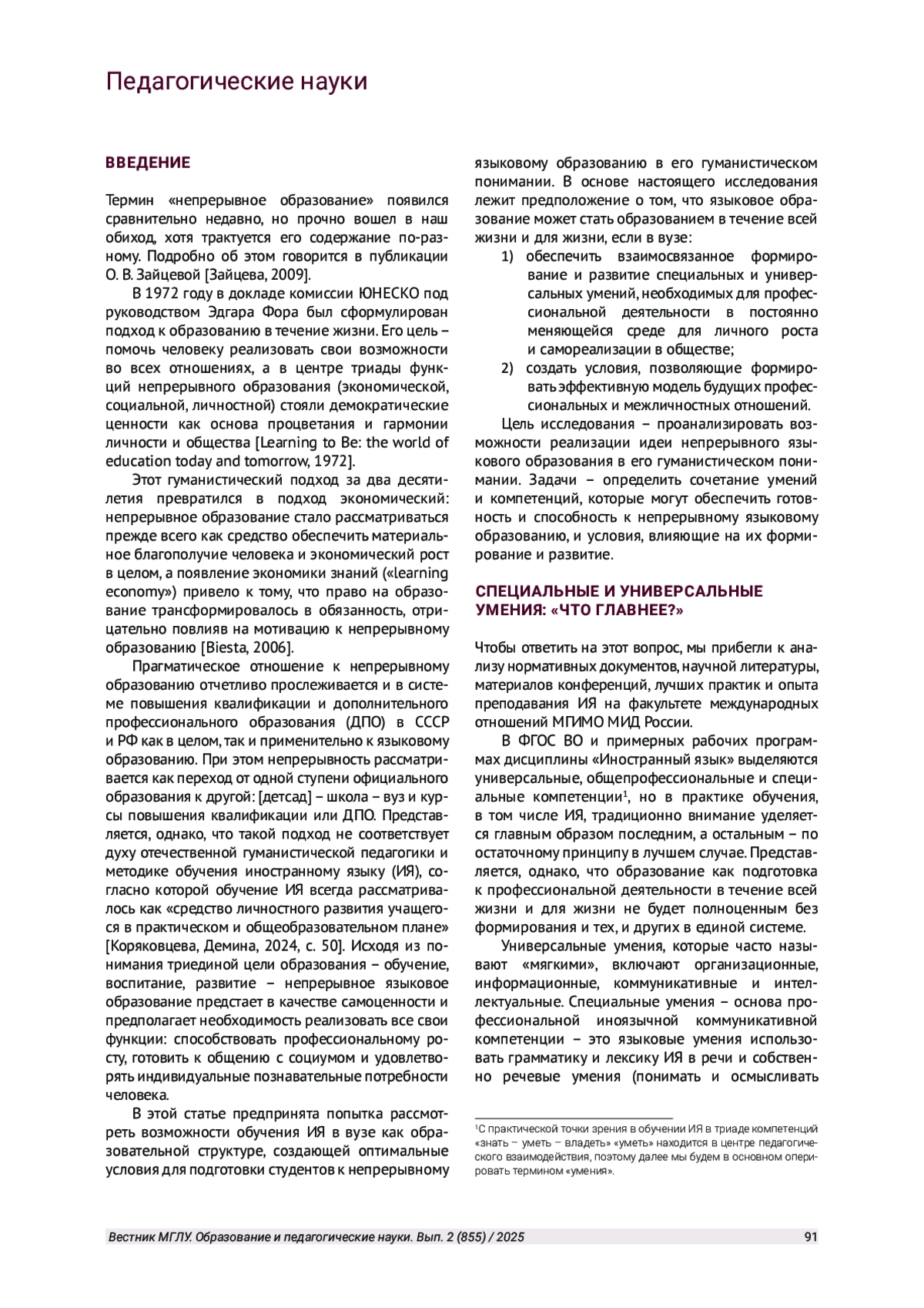 В статье исследуется потенциал обучения иностранному языку в вузе как подготовки к непрерывному языковому образованию в его гуманистическом понимании. На основе теоретического анализа и изучения лучших практик Московского государственного института международных отношений определены оптимальное сочетание универсальных и специальных умений, а также совокупность условий, обеспечивающих их взаимосвязанное развитие. В работе также рассмотрены возможности искусственного интеллекта, технологически изменяющего среду обучения.