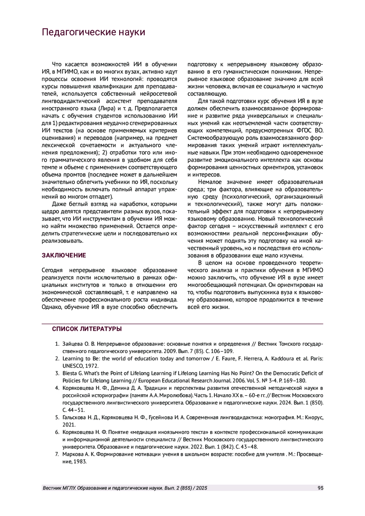 13. Мещерякова О. В. Возможности использования искусственного интеллекта для повышения мотивации студентов к изучению иностранных языков в вузе // Современные проблемы науки и образования. 2023. № 6. С. 92-98.