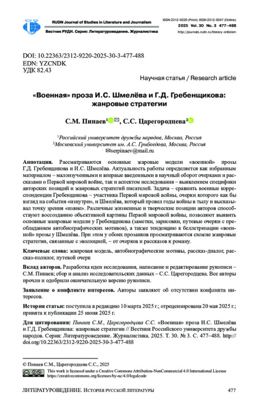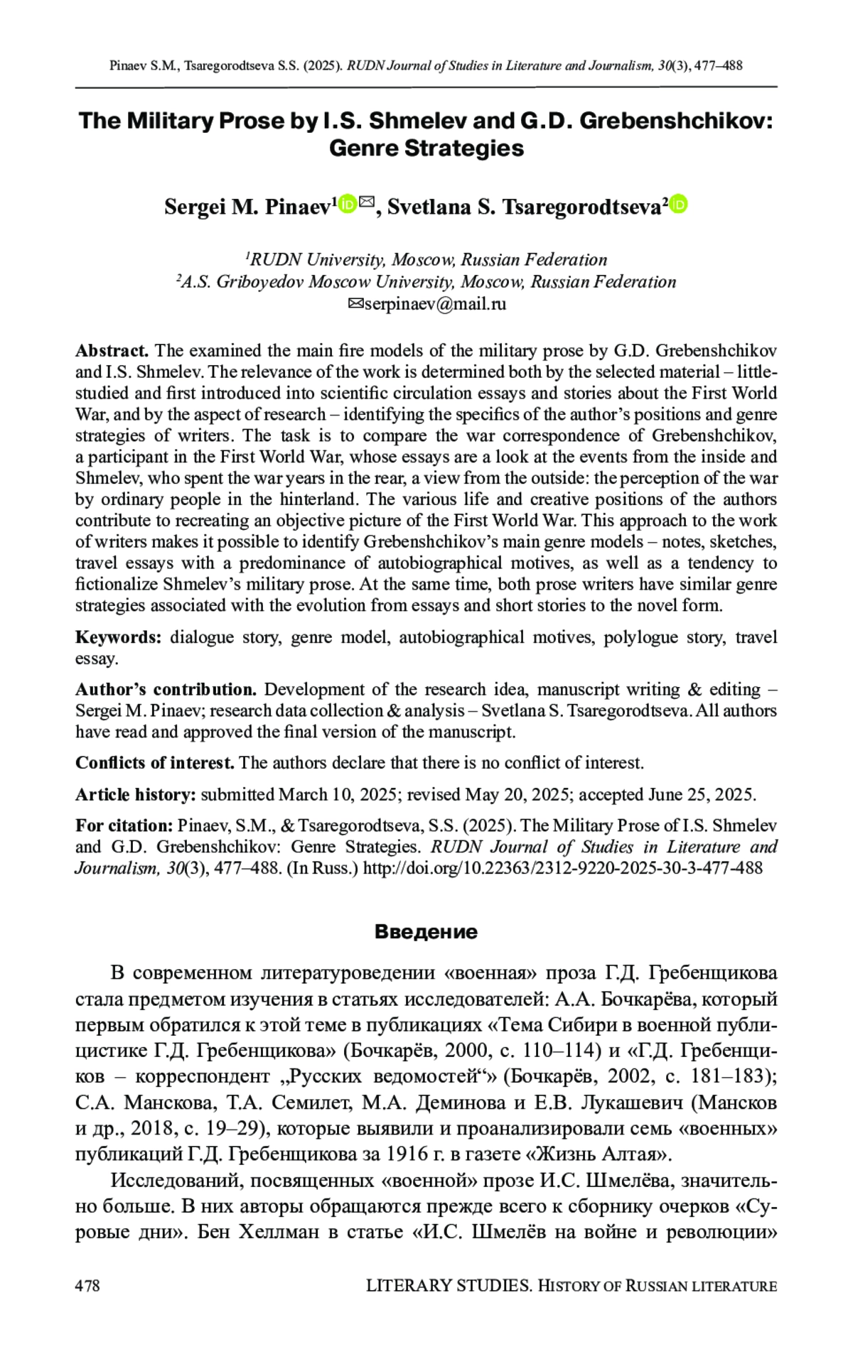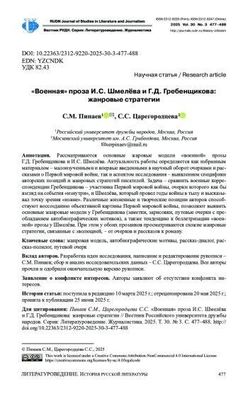 Рассматриваются основные жаровые модели «военной» прозы Г. Д. Гребенщикова и И. С. Шмелёва. Актуальность работы определяется как избранным материалом - малоизученными и впервые введенными в научный оборот очерками и рассказами о Первой мировой войне, так и аспектом исследования - выявлением специфики авторских позиций и жанровых стратегий писателей. Задача - сравнить военные корреспонденции Гребенщикова - участника Первой мировой войны, очерки которого как бы взгляд на события «изнутри», и Шмелёва, который провел годы войны в тылу и высказывал точку зрения «извне». Различные жизненные и творческие позиции авторов способствуют воссозданию объективной картины Первой мировой войны, позволяют выявить основные жанровые модели у Гребенщикова (заметки, зарисовки, путевые очерки с преобладанием автобиографических мотивов), а также тенденцию к беллетризации «военной» прозы у Шмелёва. При этом у обоих прозаиков просматриваются схожие жанровые стратегии, связанные с эволюцией, - от очерков и рассказов к роману.