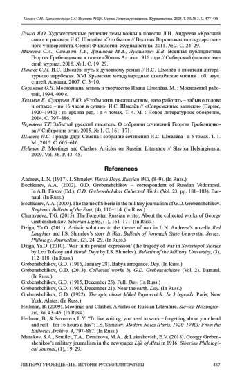 11. Дзыга Я.О. Художественные решения темы войны в повести Л.Н. Андреева “Красный смех” и рассказе И.С. Шмелёва “Это было” // Вестник Воронежского государственного университета. Серия: Филология. Журналистика. 2011. № 2. С. 24-29. EDN: NBWGCC