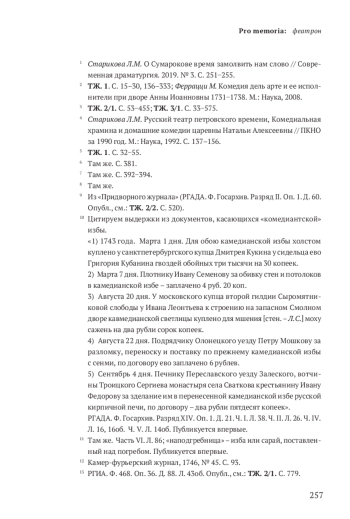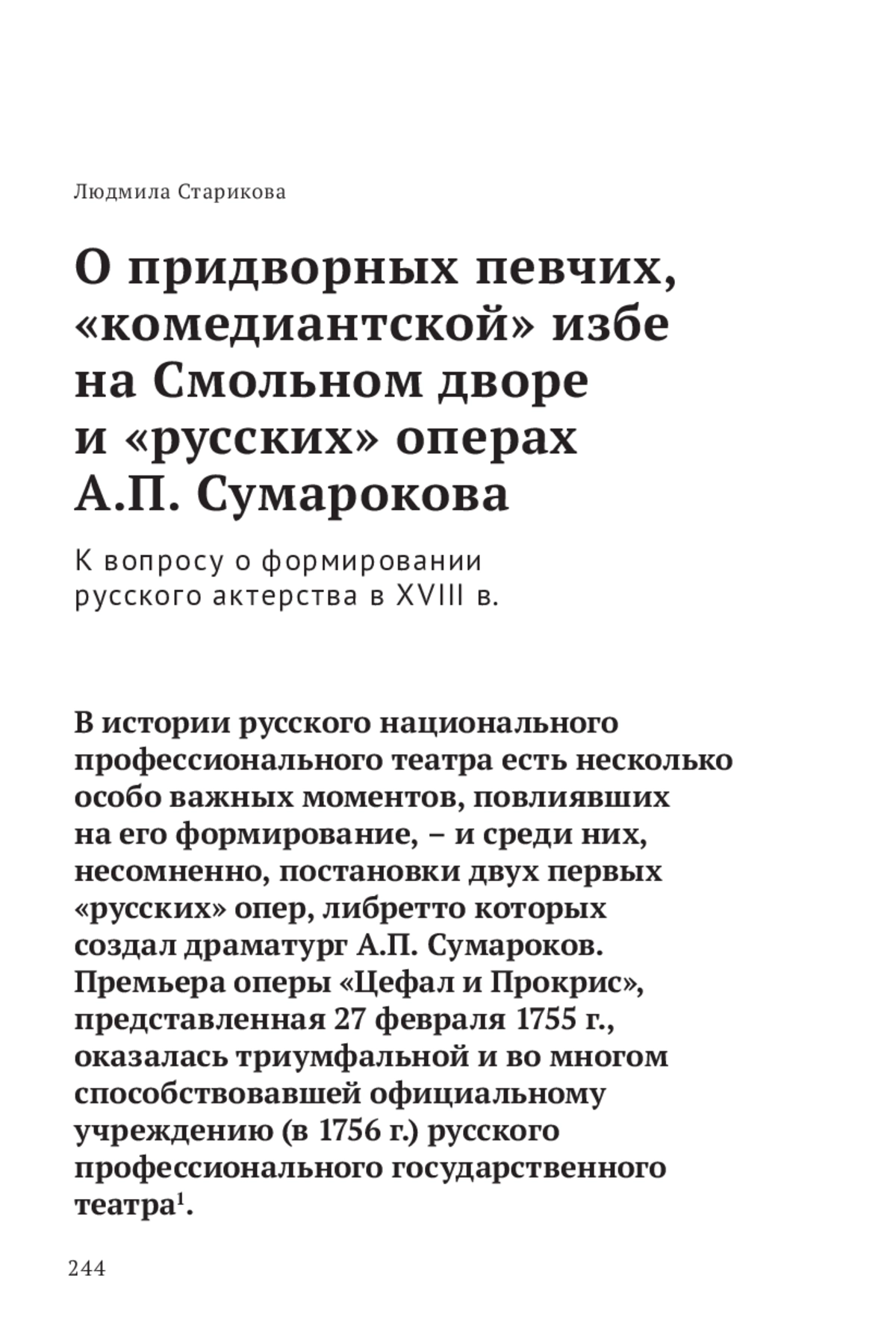 СТАРИКОВА Л. М. О ПРИДВОРНЫХ ПЕВЧИХ, «КОМЕДИАНТСКОЙ» ИЗБЕ НА СМОЛЬНОМ ДВОРЕ И «РУССКИХ» ОПЕРАХ А. П. СУМАРОКОВА // ВОПРОСЫ ТЕАТРА. 2024. № 3-4