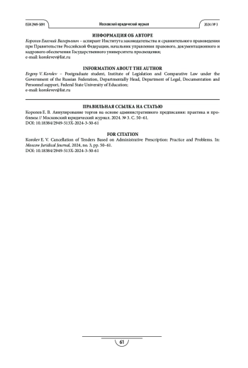 Теоретическая и/или практическая значимость. Выделены основные проблемы аннулирования торгов на основании административного предписания, препятствующих эффективному и справедливому применению данной меры, а также формулирования предложений по совершенствованию законодательства и правоприменения.