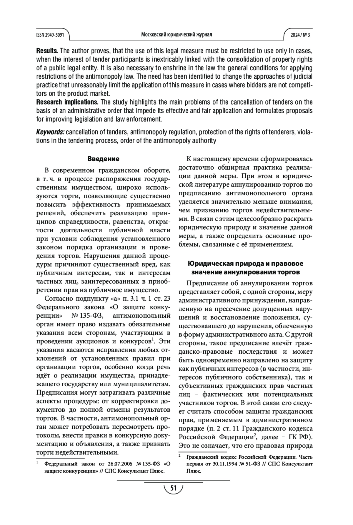 Процедура и методы. В работе с использованием функционального метода определяется правовая природа аннулирования торгов на основании административного предписания. Посредством анализа норм права и судебной практики проводится разграничение между данной мерой и признанием торгов недействительными, а также выявляются различия с иными административными предписаниями, влияющими на ход торгов, определяются пределы применения данной меры. Для формулирования итоговых выводов и их проверки использовался формально-логический метод.