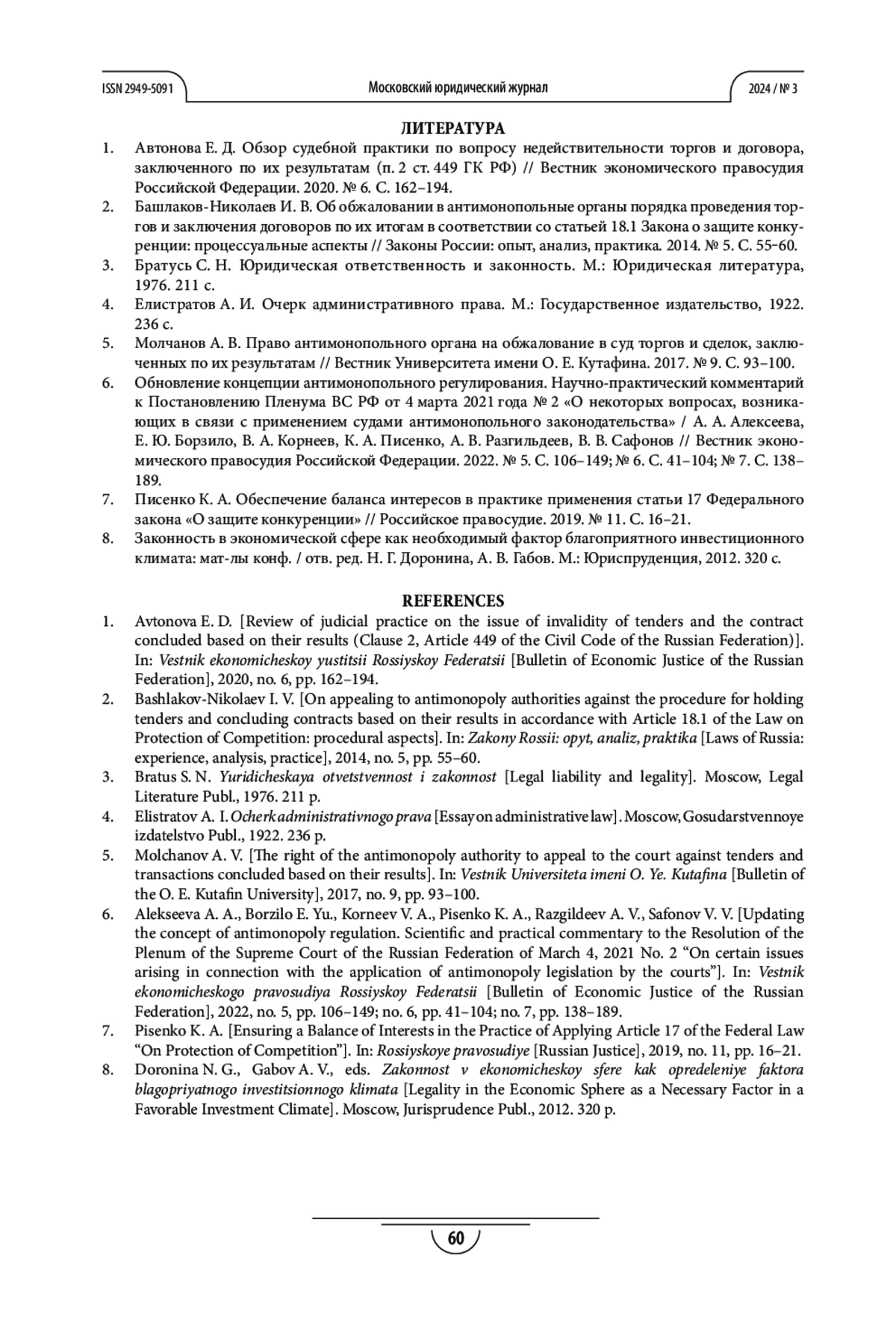 7. Писенко К. А. Обеспечение баланса интересов в практике применения статьи 17 Федерального закона «О защите конкуренции» // Российское правосудие. 2019. № 11. С. 16-21.