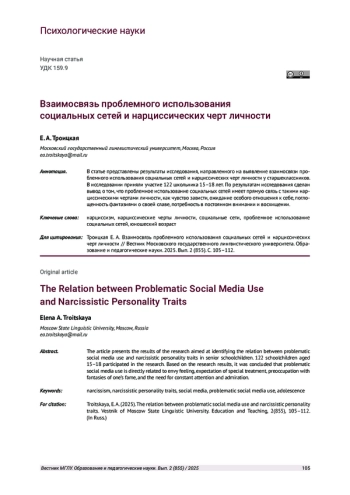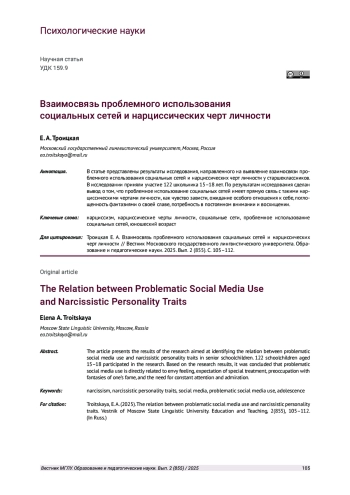 В статье представлены результаты исследования, направленного на выявление взаимосвязи проблемного использования социальных сетей и нарциссических черт личности у старшеклассников. В исследовании приняли участие 122 школьника 15-18 лет. По результатам исследования сделан вывод о том, что проблемное использование социальных сетей имеет прямую связь с такими нарциссическими чертами личности, как чувство зависти, ожидание особого отношения к себе, поглощенность фантазиями о своей славе, потребность в постоянном внимании и восхищении.