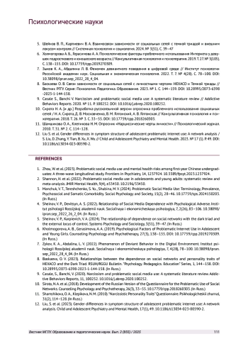 3. Манчук В. Т., Терещенко С. Ю., Шубина М. В. Проблемное использование социальных сетей: терминология, распространенность, психосоциальные факторы риска и соматическая коморбидность // Социальная психология и общество. 2024. Т. 15. № 2. C. 28-46. DOI: 10.17759/sps.2024150203 EDN: HFJDVL