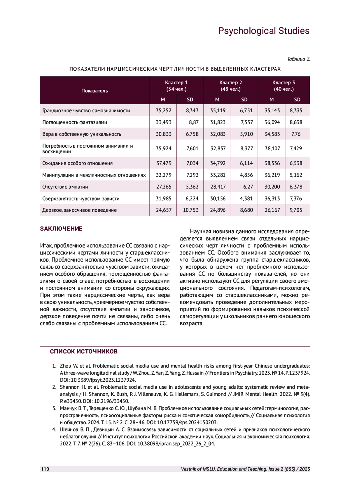 1. Zhou W. et al. Problematic social media use and mental health risks among first-year Chinese undergraduates: A three-wave longitudinal study / W. Zhou, Z. Yan, Z. Yang, Z. Hussain // Frontiers in Psychiatry. 2023. № 14. P. 1237924. DOI: 10.3389/fpsyt.2023.1237924 EDN: DPTEPH