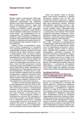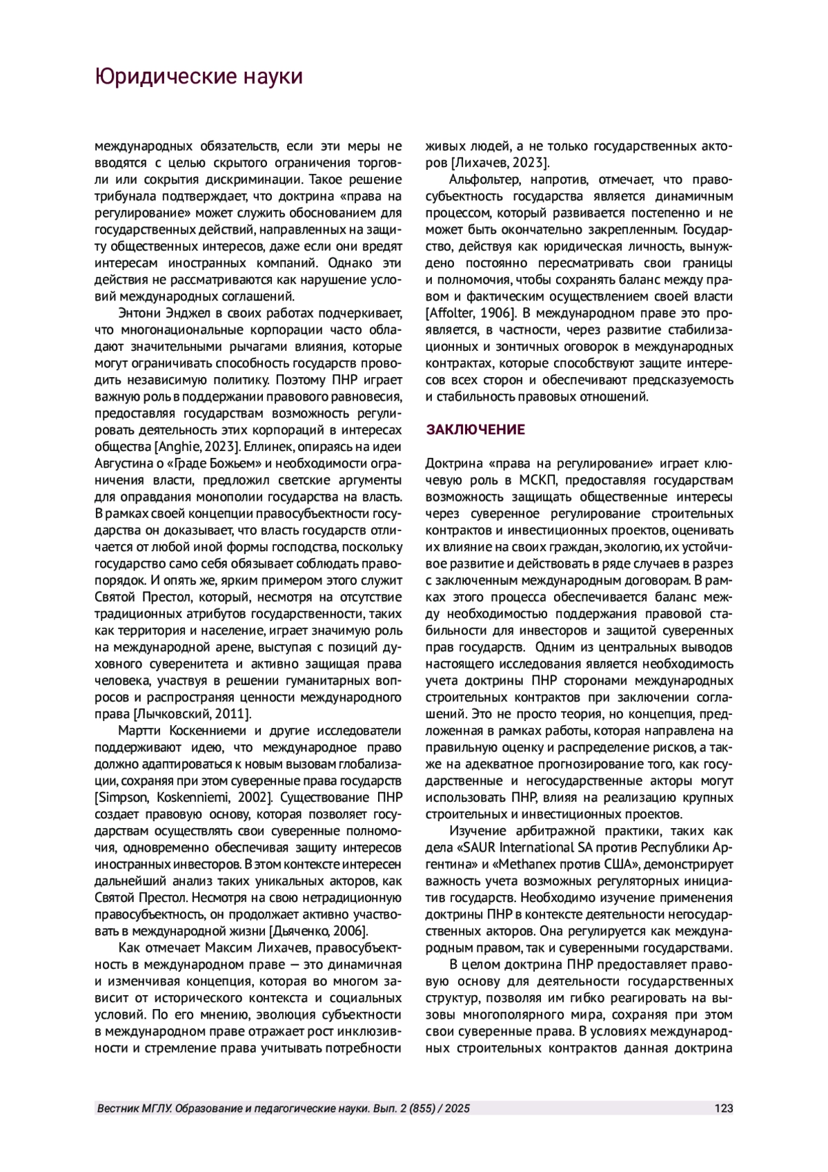 В статье рассматривается влияние доктрины «права на регулирование» на правосубъектность государств и негосударственных акторов в международном строительном контрактном праве. Рассматриваются вопросы баланса суверенных прав и корпоративных интересов, анализируется судебная практика. По результатам исследования определяются правовые последствия применения права на регулирование в составлении международных контрактов.