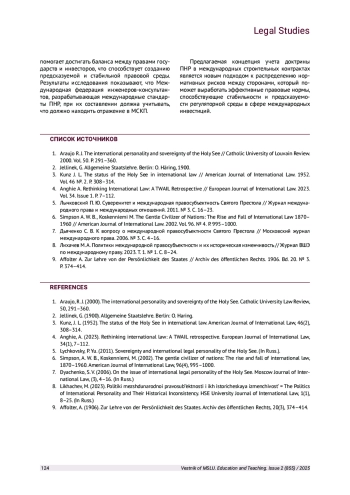5. Лычковский П. Ю. Суверенитет и международная правосубъектность Святого Престола // Журнал международного права и международных отношений. 2011. № 3. С. 16-23. EDN: GDGAFG