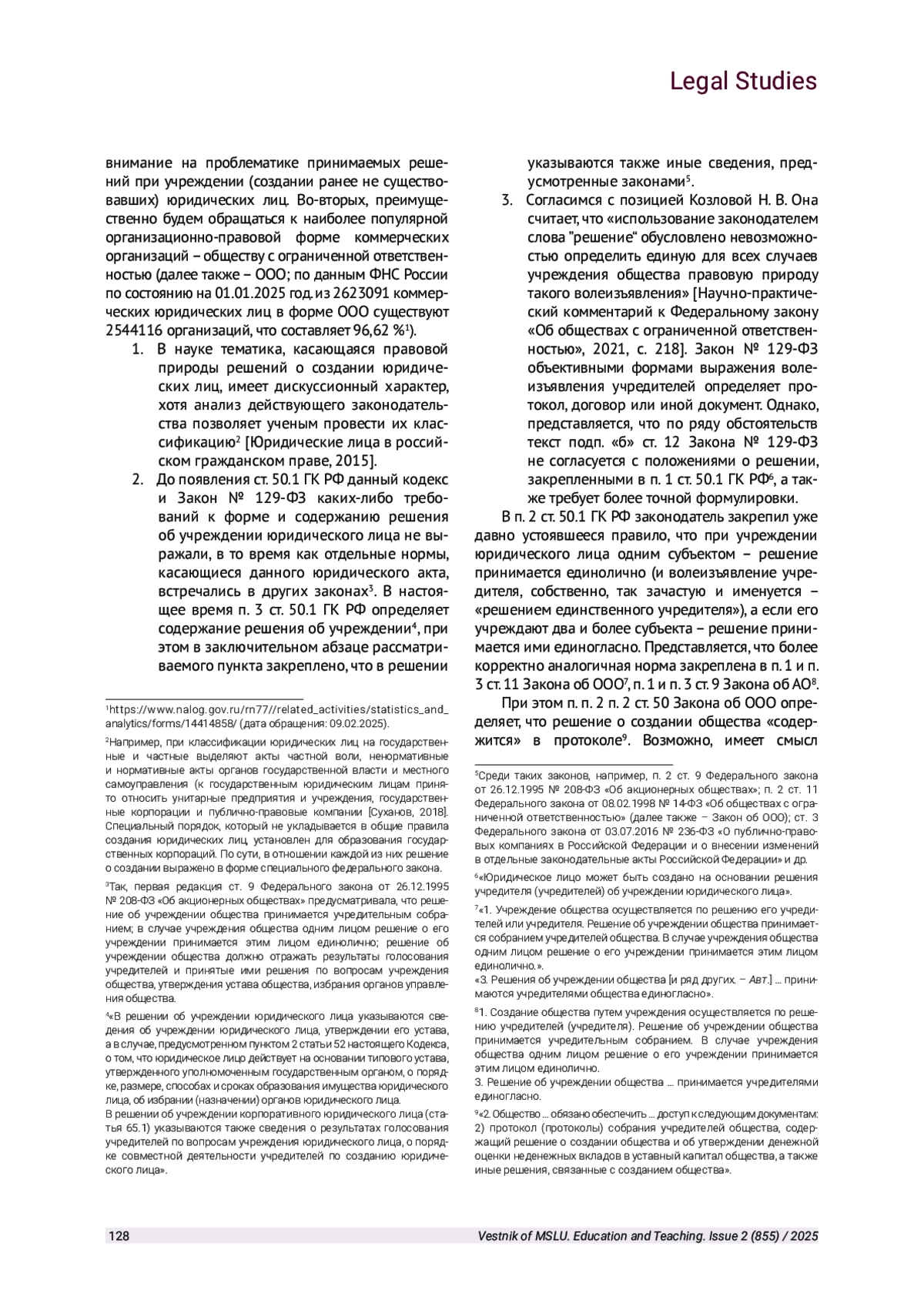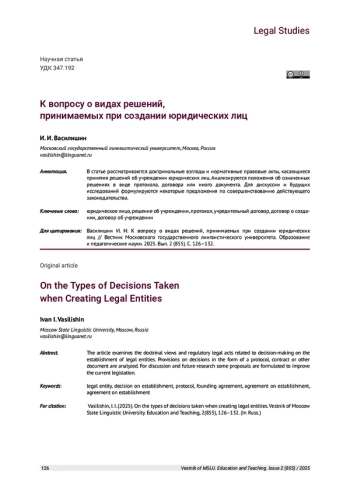 В статье рассматриваются доктринальные взгляды и нормативные правовые акты, касающиеся принятия решений об учреждении юридических лиц. Анализируются положения об означенных решениях в виде протокола, договора или иного документа. Для дискуссии и будущих исследований формулируются некоторые предложения по совершенствованию действующего законодательства.