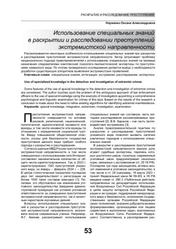 7. Трубкина О.В. К вопросу о комплексности применения специальных знаний в раскрытии и расследовании преступлений экстремистской направленности // Криминалистика: вчера, сегодня, завтра. 2023. № 2(26). С. 247-262. EDN: ZOKBWU