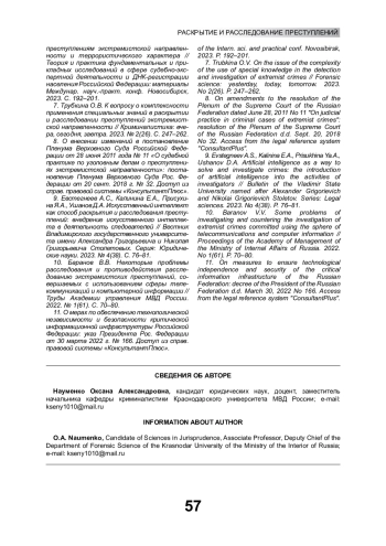 3. Баранов В.В. Некоторые проблемы расследования и противодействия расследованию экстремистских преступлений, совершаемых с использованием сферы телекоммуникаций и компьютерной информации // Труды Академии управления МВД России. 2022. № 1(61). С. 70-80. EDN: ZBPKBG