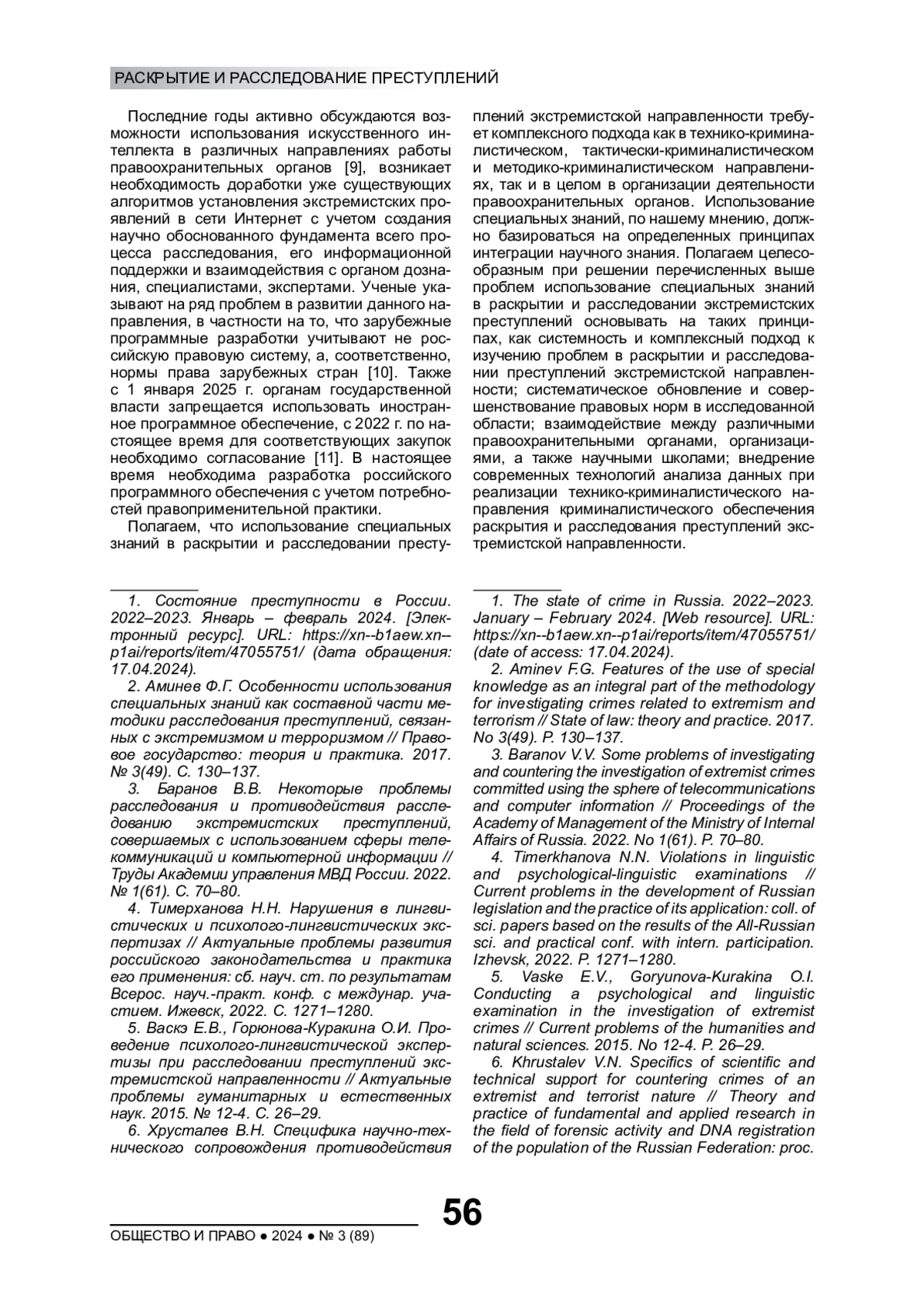5. Васкэ Е.В., Горюнова-Куракина О.И. Проведение психолого-лингвистической экспертизы при расследовании преступлений экстремистской направленности // Актуальные проблемы гуманитарных и естественных наук. 2015. № 12-4. С. 26-29. EDN: VHHMYD