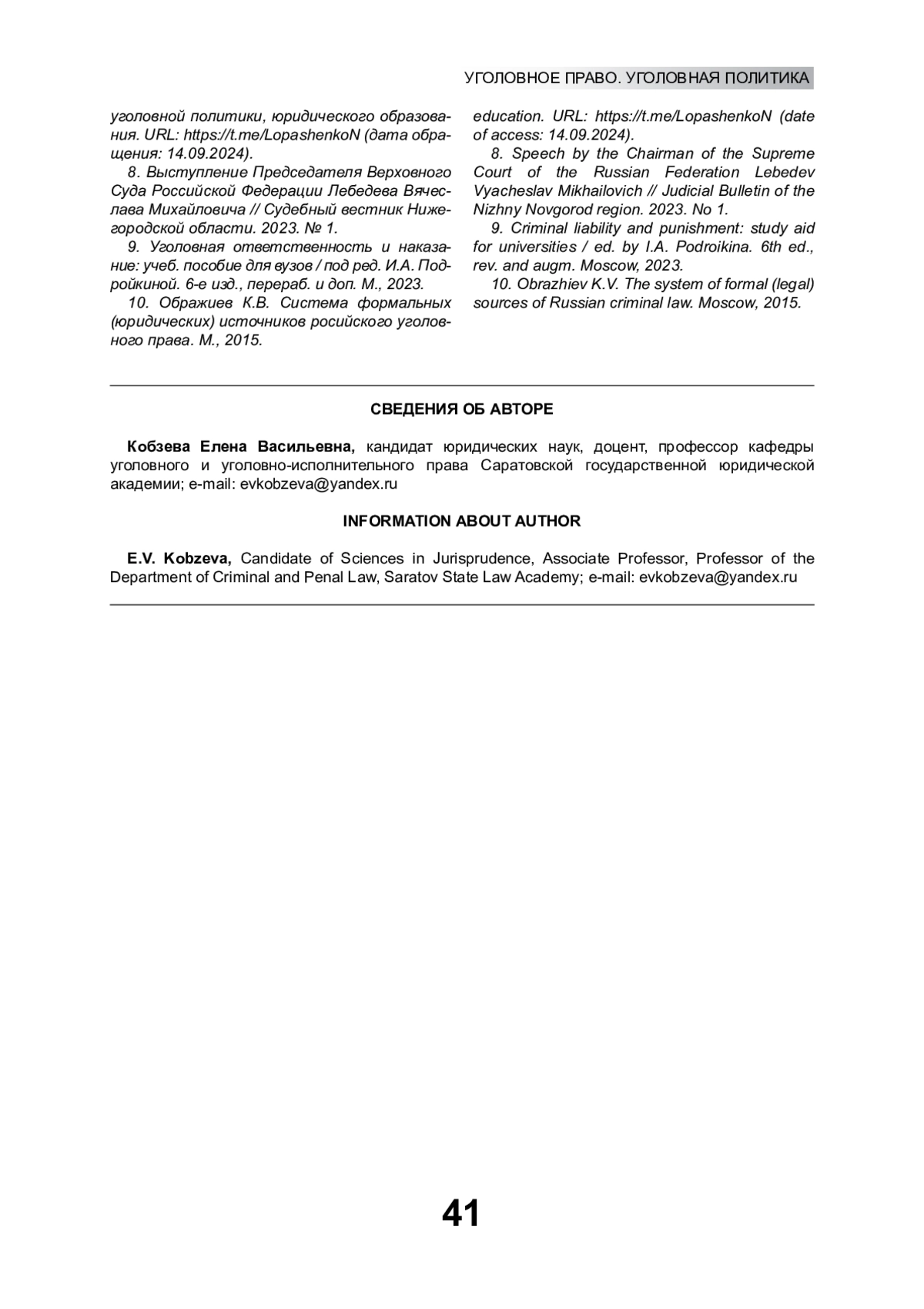 10. Ображиев К.В. Система формальных (юридических) источников росийского уголовного права. М., 2015. EDN: SZJCSR