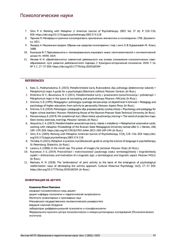 7. Sims P. A. Working with Metaphor // American Journal of Psychotherapy. 2003. Vol. 57 (4). P. 528-536. DOI: 10.1176/appi.psychotherapy.2003.57.4.528 EDN: GKIMJT