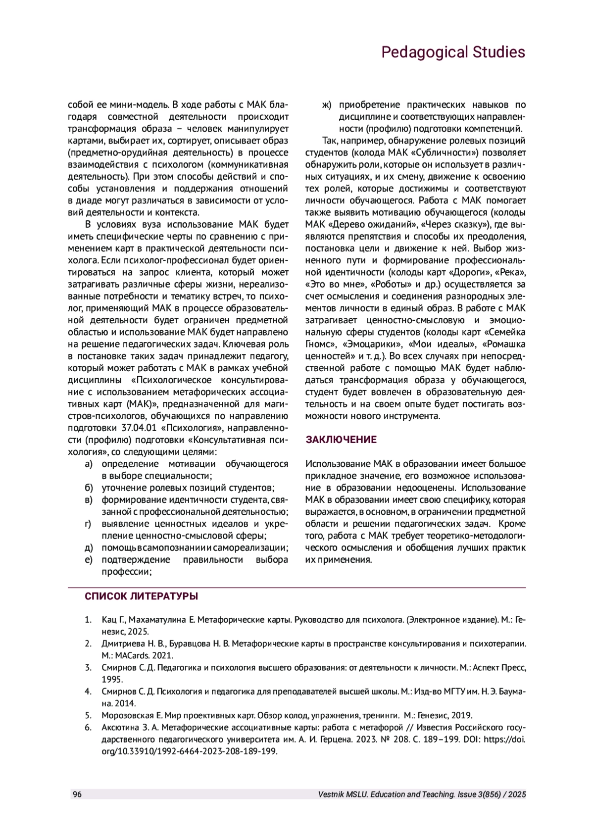 В практической работе психолога и педагога- психолога появляются и успешно применяются новые инструменты работы. К таким инструментам относятся метафорические ассоциативные карты (МАК) [Кац, Махаматулина, 2025]. Однако их применение в образовании и теоретико-методологическое осмысление остается малоизученным. Как правило, применение МАК ограничивается консультативной практикой [Дмитриева, Буравцова, 2021], в то время как их потенциал, на наш взгляд, гораздо шире, что позволяет использовать этот инструмент в образовательном процессе. Это связано с целым рядом обстоятельств.
