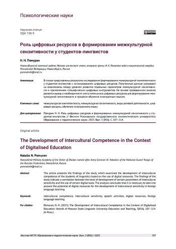 В статье представлены результаты исследования формирования межкультурной компетентности у студентов-лингвистов с использованием цифровых ресурсов. Полученные данные указывают на взаимосвязь между уровнем развития отдельных параметров межкультурной сензитивности и применением специфических цифровых инструментов. На основе проведенного анализа делается вывод о необходимости учета потенциала цифровых ресурсов для формирования межкультурной сензитивности в процессе обучения иностранным языкам.