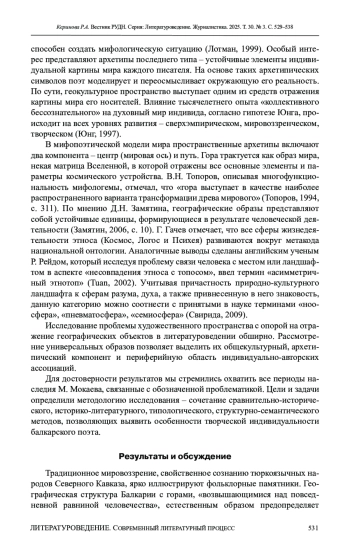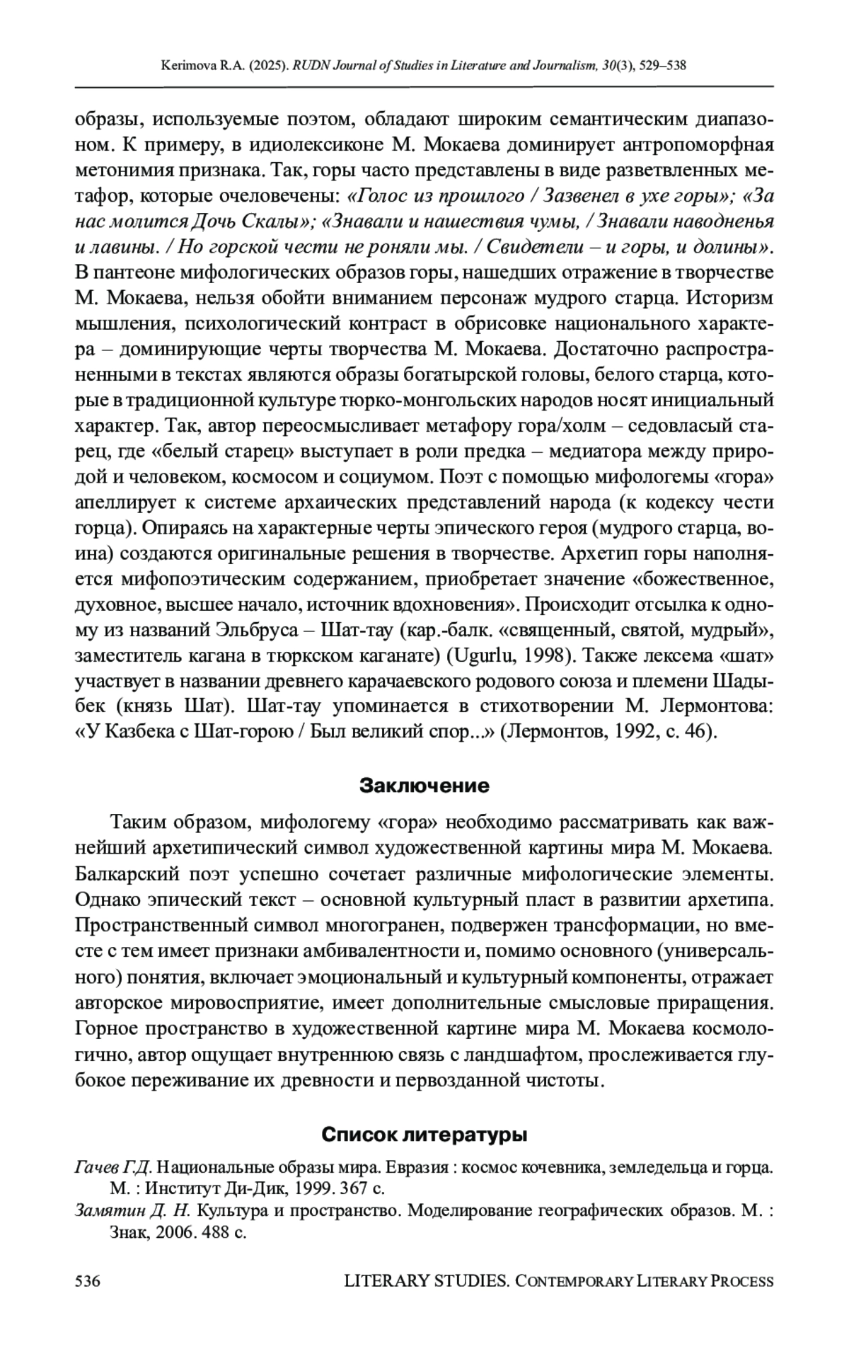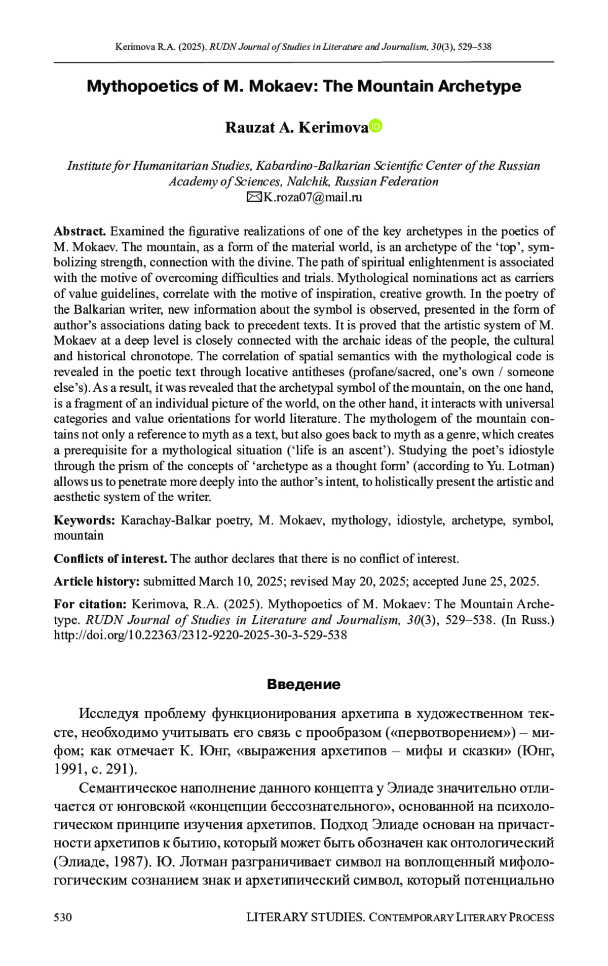 Рассматриваются образные реализации одного из ключевых архетипов в поэтике М. Мокаева. Гора как форма материального мира являет собой архетип «верха», символизирует силу, связь с божественным началом. Путь духовного просветления сопряжен с мотивом преодоления трудностей и испытаний. Мифологические номинации выступают носителями ценностных ориентиров, соотносятся с мотивом вдохновения и творческого роста. В поэзии балкарского писателя наблюдается новая информация о символе, представленная в виде авторских ассоциаций, восходящих к прецедентным текстам. Доказывается, что художественная система М. Мокаева на глубинном уровне тесно связана с архаическими представлениями народа, культурно-историческим хронотопом. Соотнесенность пространственной семантики с мифологическим кодом обнаруживается в поэтическом тексте посредством локативных антитез (профанное/сакральное, свое/чужое). В результате выявлено, что архетипический символ «гора», с одной стороны, - это фрагмент индивидуальной картины мира, а с другой - он взаимодействует с универсальными для мировой литературы категориями и ценностными ориентациями. Мифологема горы - это не только отсылка к мифу как к тексту, но и к мифу как жанру, что создает предпосылку к мифологической ситуации («жизнь - восхождение»). Изучение идиостиля поэта сквозь призму понятия «архетип как мыслеформа» (по Ю. Лотману) позволяет глубже проникнуть в авторский замысел, целостно представить художественно-эстетическую систему писателя.