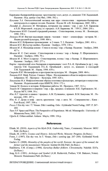 4. Кучукова З.А. Онтологический метакод как ядро этнопоэтики: карачаево-балкарская ментальность в зеркале поэзии. Нальчик: Изд-во М. и В. Котляровых, 2005. 309 с. EDN: QSJRUT