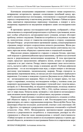 3. Лушникова Г.И., Осадчая Т.Ю. Контаминация тенденций постмодернизма и пост-постмодернизма в творчестве Дж. Франзена // Филологический класс. 2021. Т. 26. № 2. С. 200-211. DOI: 10.51762/1FK-2021-26-02-17 EDN: EQUQGF