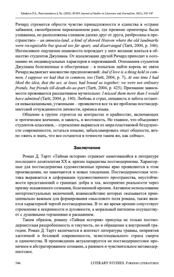 Цель исследования - выявление специфических черт постмодернистского и метамодернистского дискурса в романе Д. Тартт «Тайная история», синтез которых позволяет характеризовать произведение как переходное явление, отражающее кризис базовых установок постмодернизма и становление художественной парадигмы метамодернизма. Научная новизна работы связана со смещением ракурса анализа текста с рассмотрения нравственной проблематики и жанрового своеобразия на включение романа в контекст фундаментальных изменений эпохи пост-постмодернизма. Проведенное исследование позволяет сделать вывод, что поэтика «Тайной истории» во многом определяется спецификой эстетики постмодернизма. Это выражается в мозаичности сознания рассказчика и отсутствии морально-этических императивов, активности интертекстуальных включений, формирующих смысловое поле романа, разрушении противопоставления между «элитарной» и «массовой» культурой. Во второй части выдвигается и доказывается тезис о том, что дебютный роман Д. Тартт обладает чертами, выходящими за рамки постмодернистской парадигмы, в нем обнаруживаются ключевые тенденции, присущие метамодернизму: обращение к травмирующему опыту прошлого, проблеме рефлексии и выражения искренних переживаний, стремление к созданию устойчивой социальной общности в противовес постмодернистской разрозненности.