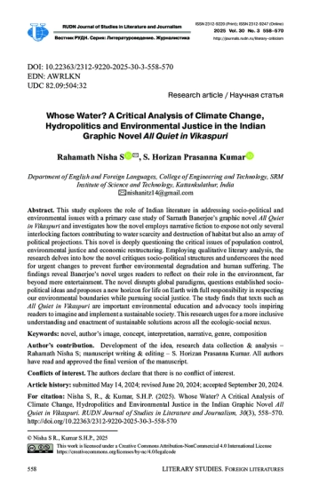 Рассматривается роль индийской литературы в решении социально-политических и экологических проблем на примере графического романа Сарнатха Банерджи «В Викаспури все спокойно». Исследуется, как используется повествовательная фантастика, чтобы выявить не только взаимосвязанные факторы, способствующие нехватке воды и разрушению среды обитания, но и ряд политических прогнозов. Роман ставит под сомнение важнейшие вопросы контроля рождаемости, экологической справедливости и экономической реструктуризации. Качественный литературный анализ показывает, как критикуются социально-политические структуры, подчеркивается необходимость срочных изменений для предотвращения экологической катастрофы и человеческих страданий. В результате можно сделать вывод, что Банерджи призывает задуматься о своей роли в сохранении окружающей среды, выйдя за рамки простого развлечения. Роман разрушает глобальные парадигмы, ставит под сомнение устоявшиеся социально-политические идеи, пропагандируя полную ответственность за жизнь на Земле, уважение экологических границ и стремление к социальной справедливости. Такие тексты, как «В Викаспури все спокойно», являются важными инструментами экологического образования и пропаганды, вдохновляющими читателей на создание и реализацию устойчивого общества, призывающими к более инклюзивному пониманию и принятию устойчивых решений во всех эколого-социальных связях.