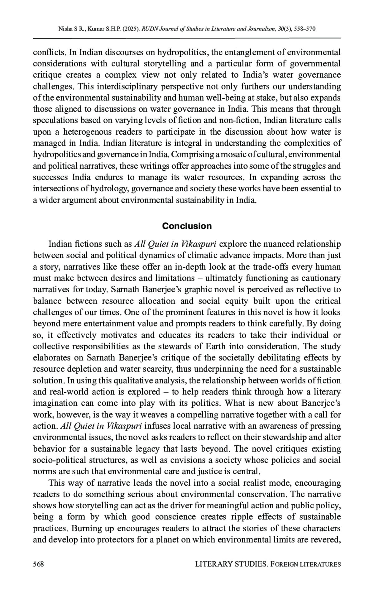 This study explores the role of Indian literature in addressing socio-political and environmental issues with a primary case study of Sarnath Banerjee’s graphic novel All Quiet in Vikaspuri and investigates how the novel employs narrative fiction to expose not only several interlocking factors contributing to water scarcity and destruction of habitat but also an array of political projections. This novel is deeply questioning the critical issues of population control, environmental justice and economic restructuring. Employing qualitative literary analysis, the research delves into how the novel critiques socio-political structures and underscores the need for urgent changes to prevent further environmental degradation and human suffering. The findings reveal Banerjee’s novel urges readers to reflect on their role in the environment, far beyond mere entertainment. The novel disrupts global paradigms, questions established sociopolitical ideas and proposes a new horizon for life on Earth with full responsibility in respecting our environmental boundaries while pursuing social justice. The study finds that texts such as All Quiet in Vikaspuri are important environmental education and advocacy tools inspiring readers to imagine and implement a sustainable society. This research urges for a more inclusive understanding and enactment of sustainable solutions across all the ecologic-social nexus.