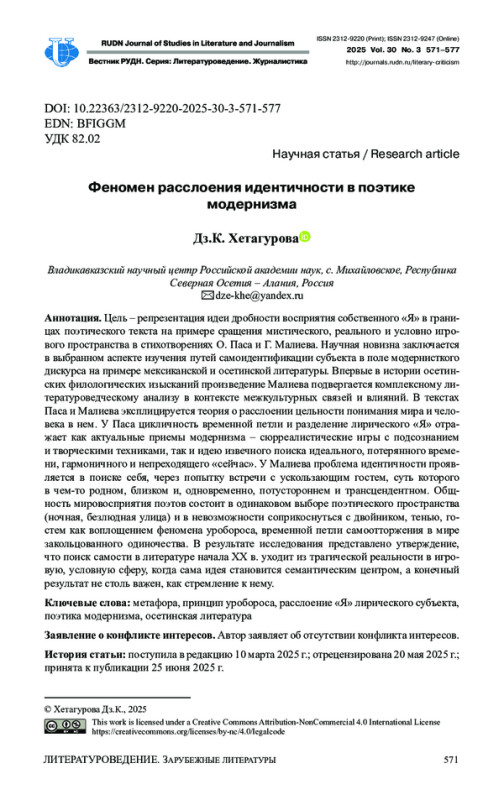 Цель - репрезентация идеи дробности восприятия собственного «я» в границах поэтического текста на примере сращения мистического, реального и условно игрового пространства в стихотворениях О. Паса и Г. Малиева. Научная новизна заключается в выбранном аспекте изучения путей самоидентификации субъекта в поле модернисткого дискурса на примере мексиканской и осетинской литературы. Впервые в истории осетинских филологических изысканий произведение Малиева подвергается комплексному литературоведческому анализу в контексте межкультурных связей и влияний. В текстах Паса и Малиева эксплицируется теория о расслоении цельности понимания мира и человека в нем. У Паса цикличность временной петли и разделение лирического «я» отражает как актуальные приемы модернизма - сюрреалистические игры с подсознанием и творческими техниками, так и идею извечного поиска идеального, потерянного времени, гармоничного и непреходящего «сейчас». У Малиева проблема идентичности проявляется в поиске себя, через попытку встречи с ускользающим гостем, суть которого в чем-то родном, близком и, одновременно, потустороннем и трансцендентном. Общность мировосприятия поэтов состоит в одинаковом выборе поэтического пространства (ночная, безлюдная улица) и в невозможности соприкоснуться с двойником, тенью, гостем как воплощением феномена уробороса, временной петли самоотторжения в мире закольцованного одиночества. В результате исследования представлено утверждение, что поиск самости в литературе начала ХХ в. уходит из трагической реальности в игровую, условную сферу, когда сама идея становится семантическим центром, а конечный результат не столь важен, как стремление к нему.