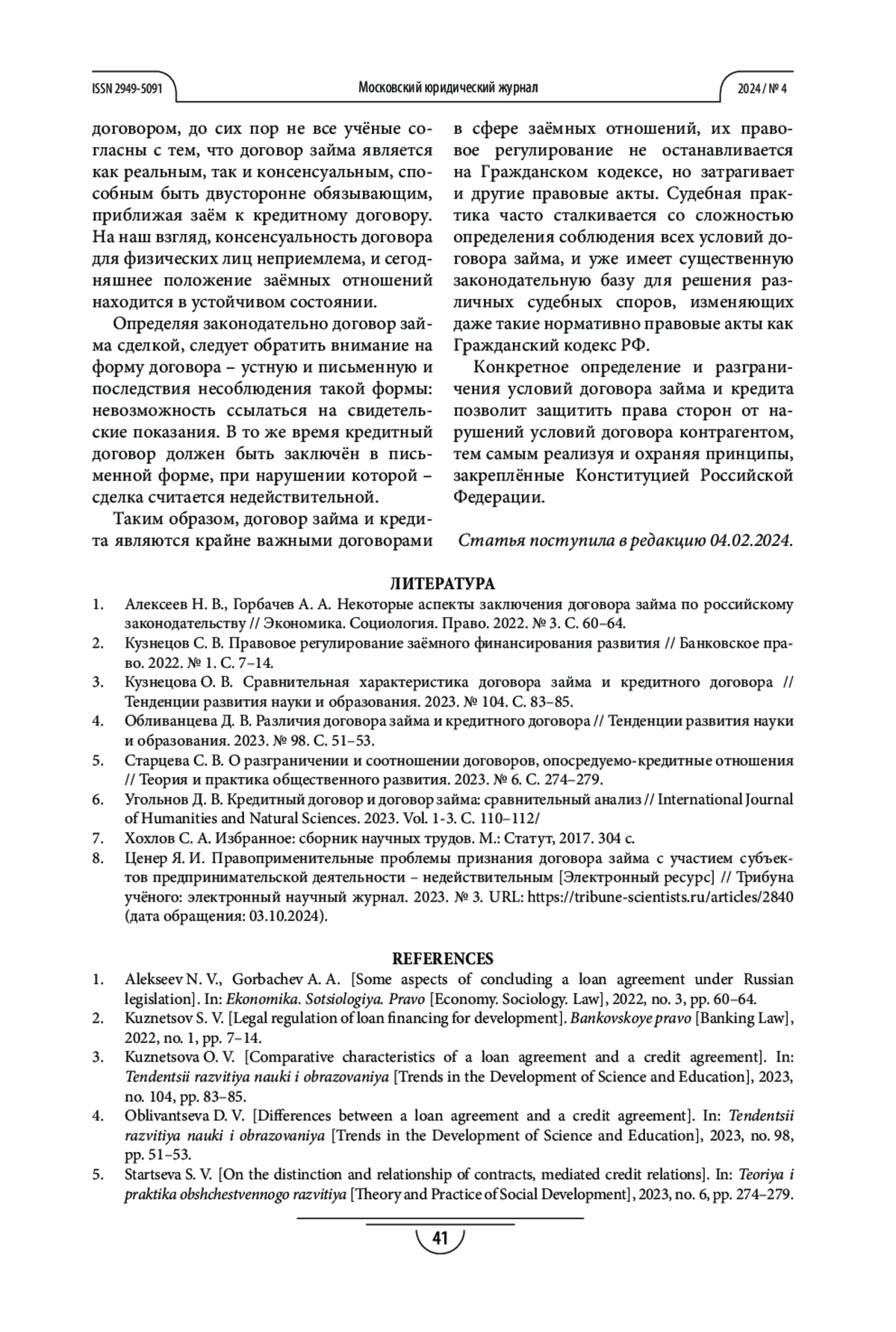 4. Обливанцева Д. В. Различия договора займа и кредитного договора // Тенденции развития науки и образования. 2023. № 98. С. 51-53.