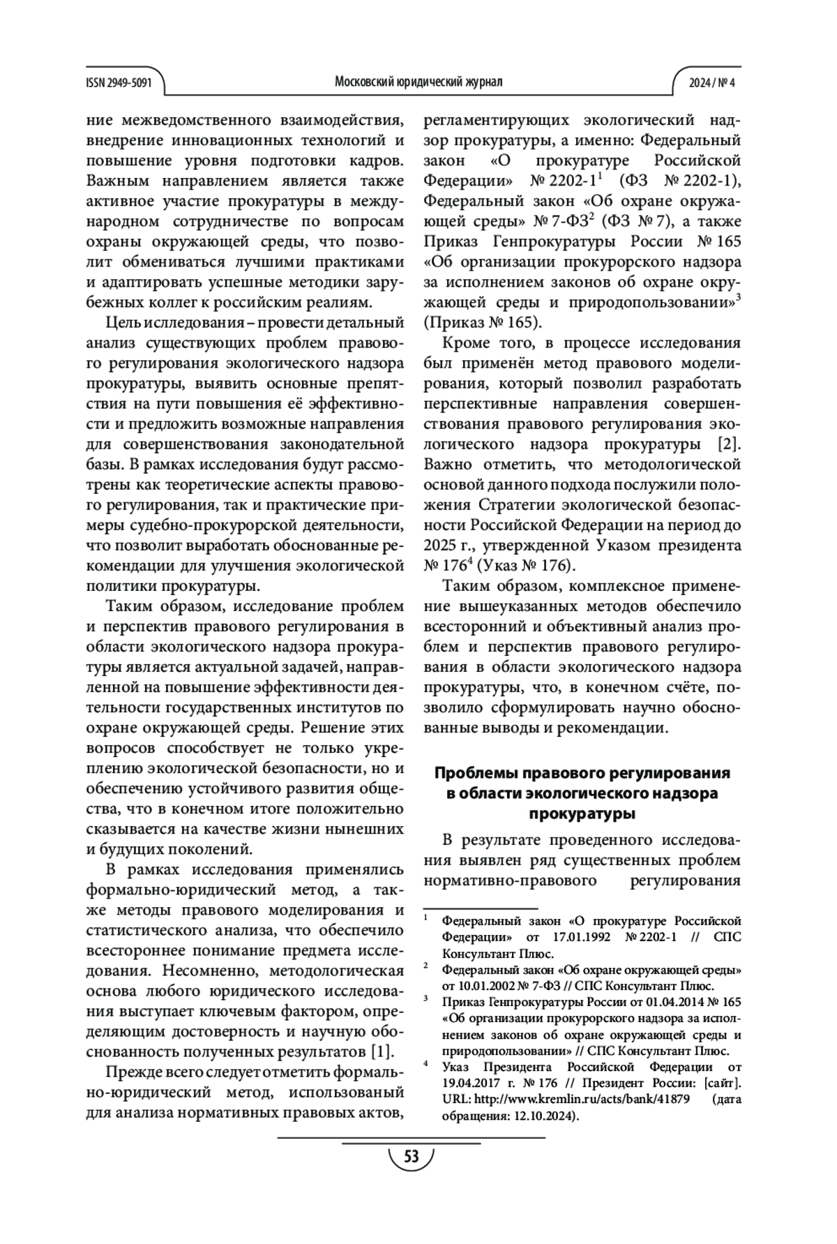 1. Андреев К. В. Роль прокурорского надзора в обеспечении экологической безопасности: вызовы и достижения // Российский научный вестник. 2024. № 1. С. 35-37.