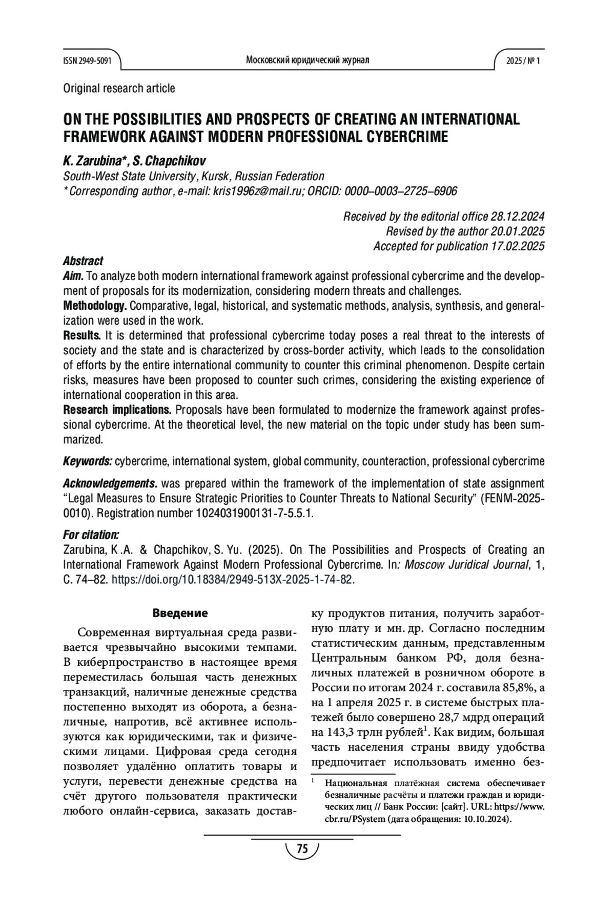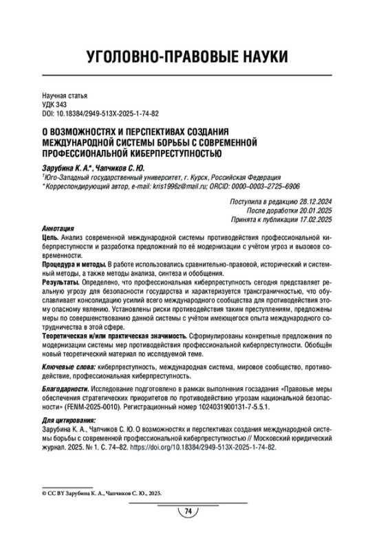 Цель. Анализ современной международной системы противодействия профессиональной киберпреступности и разработка предложений по её модернизации с учётом угроз и вызовов современности.