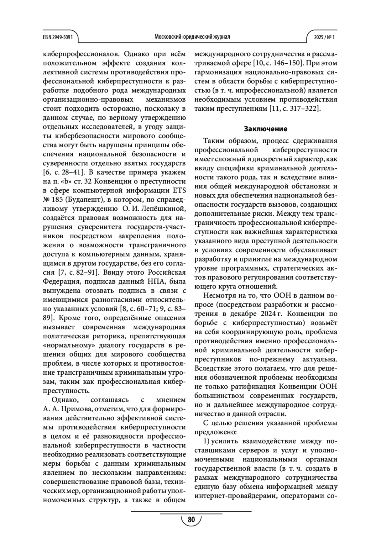 7. Лакомов А. С. Киберпреступность: современные тенденции // Академическая мысль. 2019. № 2. С. 53-56. 8. Лепешкина О. И. Киберпреступность как угроза национальной безопасности // Теоретическая и прикладная юриспруденция. 2022. № 2. С. 65-69.