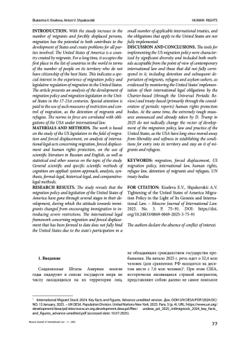 МАТЕРИАЛЫ И МЕТОДЫ. Работа базируется на исследовании законодательства США в сфере миграции и вынужденного перемещения, анализе международно-правовых актов касательно миграции, вынужденного перемещения и защиты прав человека, использовании научной литературы на русском и английском языках, а также статистических и иных источников по теме исследования. Применены общенаучные и частно-научные методы познания: системный подход, анализ, синтез, формально-юридический, историко-правовой, а также сравнительно-правовой методы.