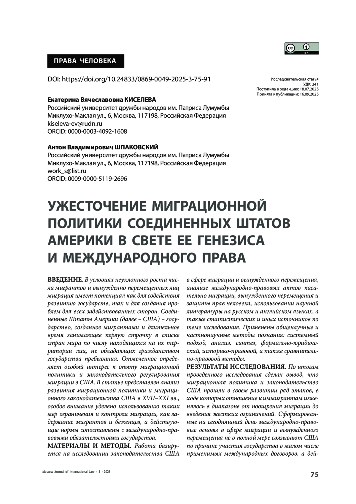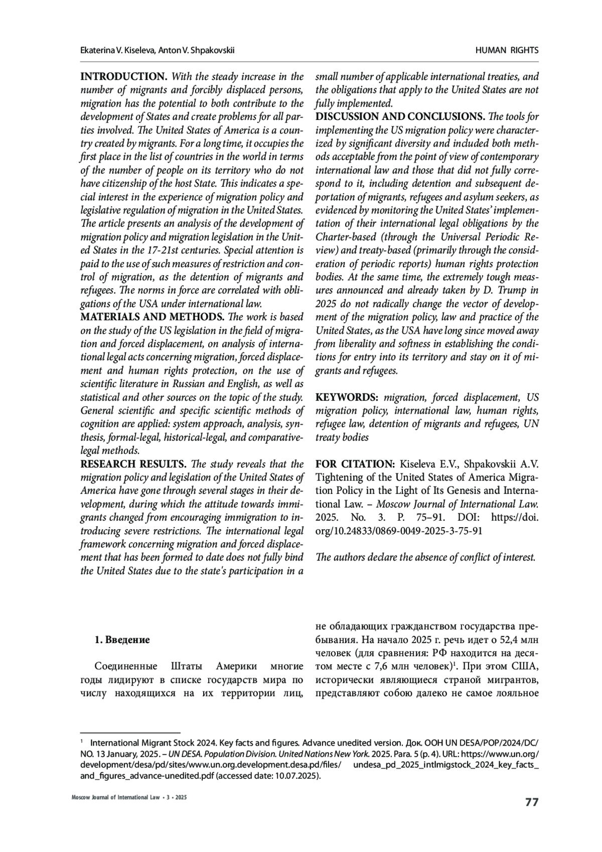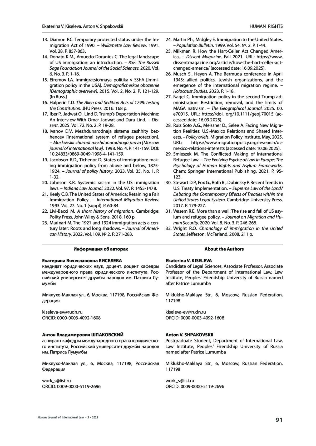 ОБСУЖДЕНИЕ И ВЫВОДЫ. Инструментарий реализации миграционной политики США характеризовался значительным разнообразием и включал в себя как допустимые с точки зрения современного международного права методы, так и не вполне ему корреспондирующие, включая задержание и последующую депортацию мигрантов, беженцев и лиц, ищущих убежище, о чем свидетельствует мониторинг уставными (через процедуру Универсального периодического обзора) и договорными (прежде всего, через рассмотрение периодических докладов) органами реализации международно-правовых обязательств США. При этом крайне жесткие меры, анонсированные и уже предпринятые Д. Трампом в 2025 г., не являются радикально меняющими вектор развития миграционной политики, права и практики США, давно отошедших от либеральности и мягкости в установлении условий въезда на свою территорию и пребывания на ней мигрантов и беженцев.