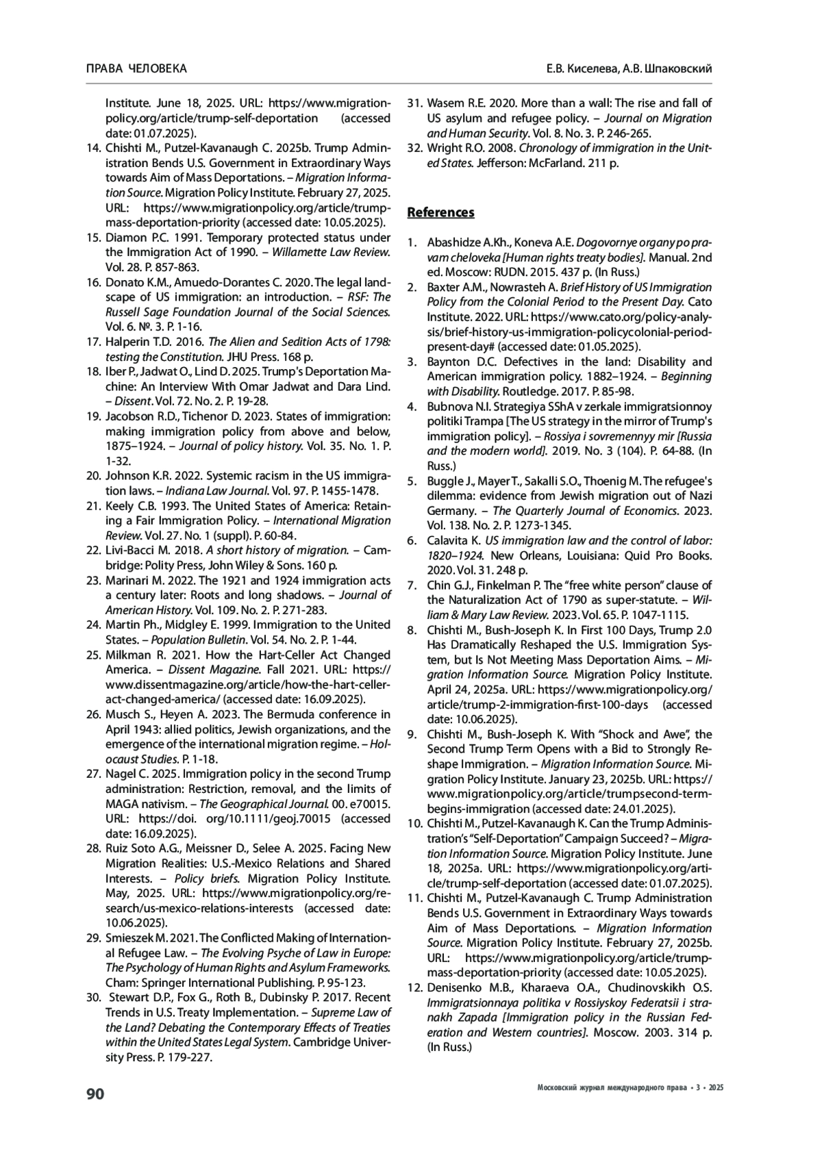 31. Wasem R.E. 2020. More than a wall: The rise and fall of US asylum and refugee policy. - Journal on Migration and Human Security. Vol. 8. No. 3. P. 246-265. 32. Wright R.O. 2008. Chronology of immigration in the United States. Jefferson: McFarland. 211 p.