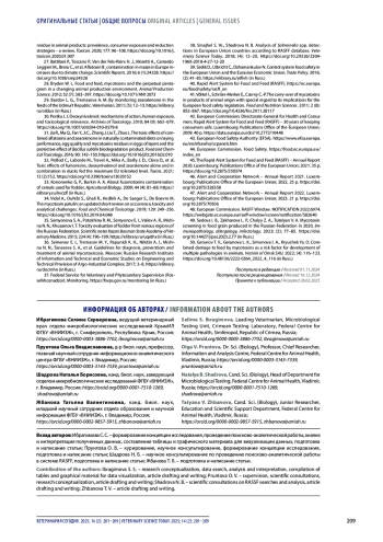 35. Семенова С. А., Потехина Р. М., Семенов Э. И., Валиев А. Р., Мишина Н. Н., Хусаинов И. Т. Оценка токсичности кормов по регионам Российской Федерации. Ученые записки Казанской государственной академии ветеринарной медицины им. Н. Э. Баумана. 2015; 224 (4): 196-199.
