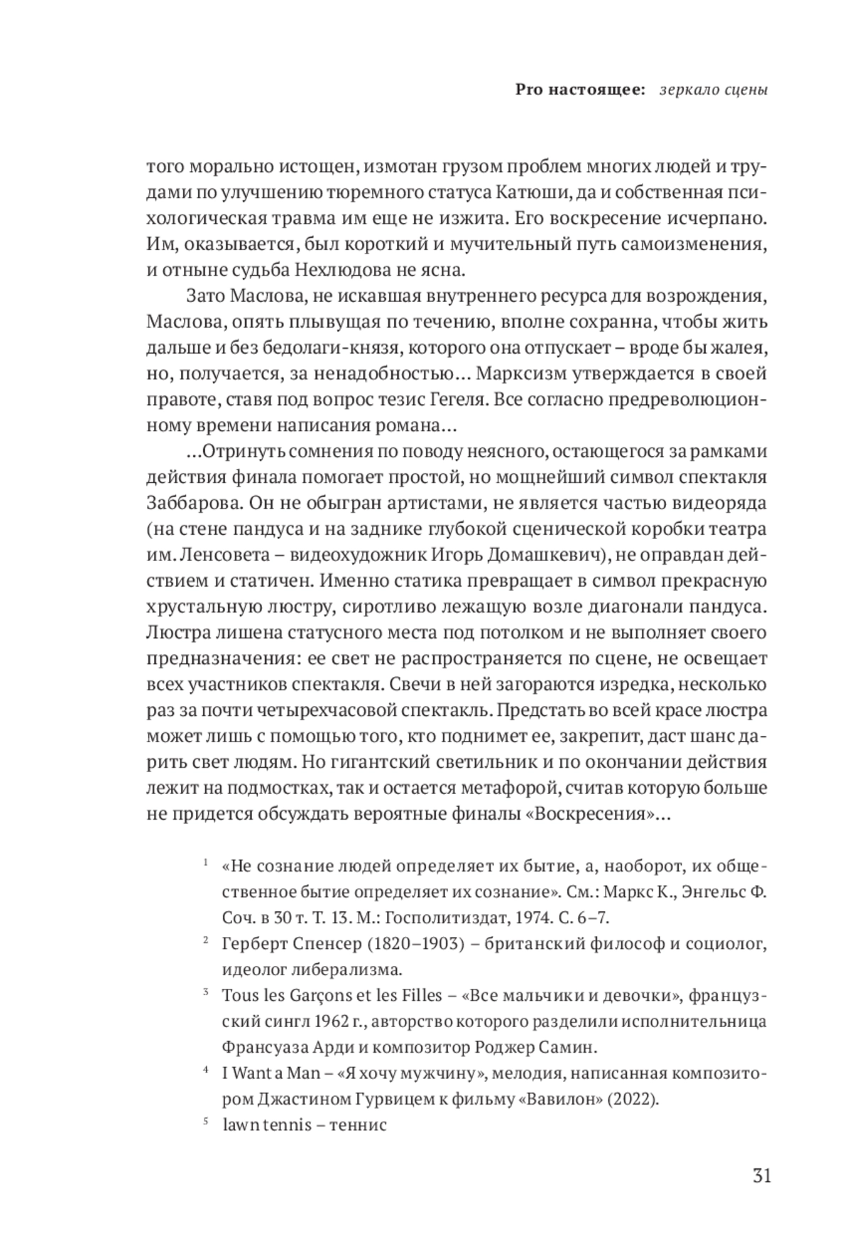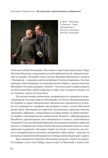 Только в «Воскресении» антимарксистская 1 мысль Гегеля о том, что бытие определяется сознанием, и чисто толстовская мысль, что выбор мы всегда осуществляем сами, так сильны, что подспудно влияют на всякого, кто добирается до последней страницы романа. Именно это, самое позднее и мудрое высказывание классика оказывает сильнейшее воздействие на читателя, дает ключ к пониманию «Анны Карениной», «Войны и мира», «Крейцеровой сонаты» и прочих творений писателя, раскладывающих смертных «на составные части», затрагивающих понятные, пройденные каждым этапы взросления и обретения себя. «Воскресение» закольцовывает все написанное Толстым, соединяет отдельные его создания, пополняет ту энциклопедию русской жизни, начало которой когда-то положил Пушкин. Оттого важно, что ныне режиссеры стали часто обращаться к «Воскресению» – роману, с трудом материализующемуся на театральной сцене, но демонстрирующему глубочайшее знание людей.